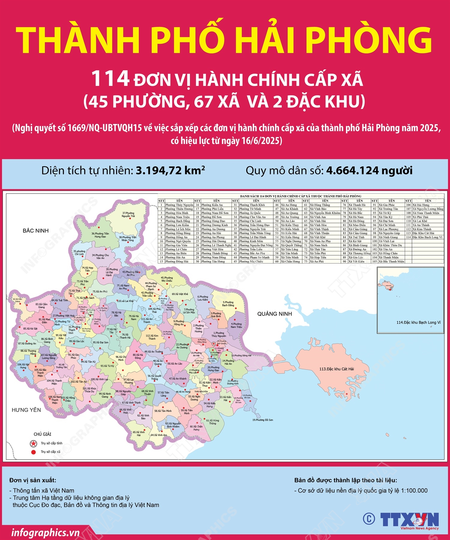 Hà Nội (TTXVN 17/6) Ngày 16/6/2025, thay mặt Ủy ban Thường vụ Quốc hội, Chủ tịch Quốc hội Trần Thanh Mẫn ký Nghị quyết số 1669/NQ-UBTVQH15 về việc sắp xếp các đơn vị hành chính cấp xã của thành phố Hải Phòng năm 2025. Nghị quyết có hiệu lực từ 16/6/2025. Theo đó, sau khi sắp xếp, thành phố Hải Phòng có 114 đơn vị hành chính cấp xã, gồm 67 xã, 45 phường và 02 đặc khu.
