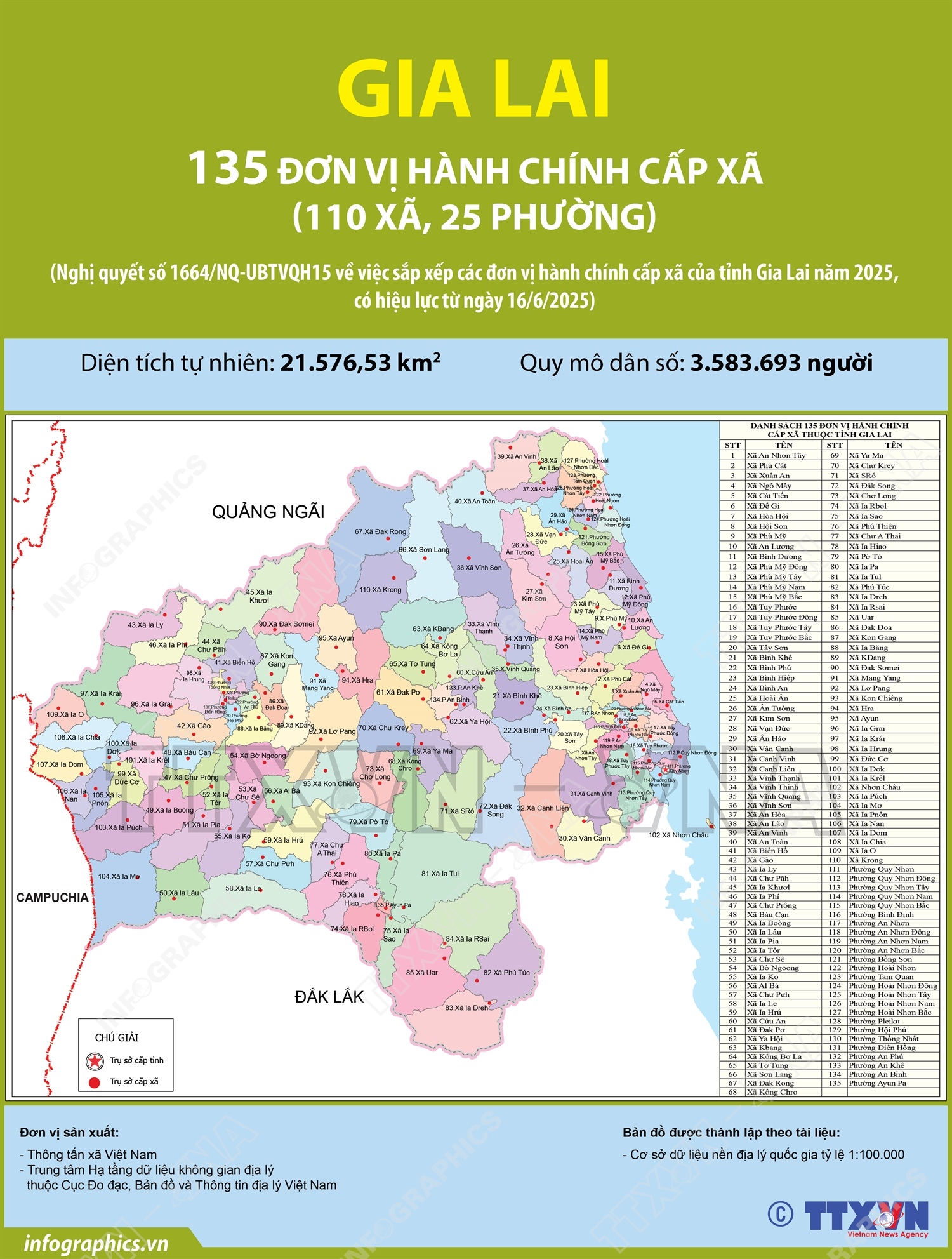 Hà Nội (TTXVN 21/6) Ngày 16/6/2025, thay mặt Ủy ban Thường vụ Quốc hội, Chủ tịch Quốc hội Trần Thanh Mẫn ký Nghị quyết số 1664/NQ-UBTVQH15 về việc sắp xếp các đơn vị hành chính cấp xã của tỉnh Gia Lai năm 2025. Nghị quyết có hiệu lực từ 16/6/2025. Theo đó, sau khi sắp xếp, tỉnh Gia Lai có 135 đơn vị hành chính cấp xã, gồm 110 xã và 25 phường; trong đó có 101 xã, 25 phường hình thành sau sắp xếp quy định tại Điều này và 09 xã không thực hiện sắp xếp là các xã Ia O (huyện Ia Grai), Nhơn Châu, Ia Púch, Ia Mơ, Ia Pnôn, Ia Nan, Ia Dom, Ia Chia và Krong.