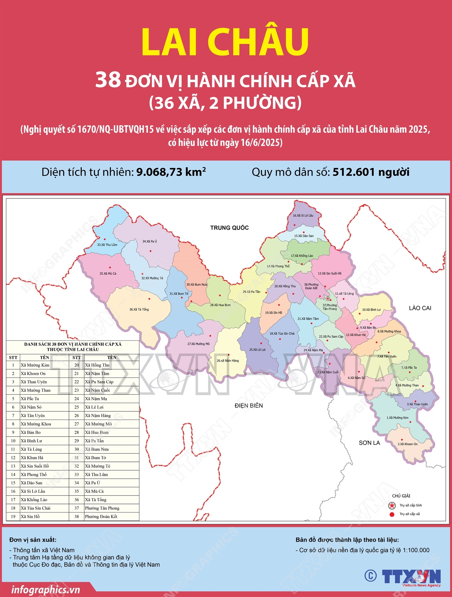 Hà Nội (TTXVN 19/6) Ngày 16/6/2025, thay mặt Ủy ban Thường vụ Quốc hội, Chủ tịch Quốc hội Trần Thanh Mẫn ký Nghị quyết số 1670/NQ-UBTVQH15 về việc sắp xếp các đơn vị hành chính cấp xã của tỉnh Lai Châu năm 2025. Nghị quyết có hiệu lực từ 16/6/2025. Theo đó, sau khi sắp xếp, tỉnh Lai Châu có 38 đơn vị hành chính cấp xã, gồm 36 xã và 02 phường; trong đó có 34 xã và 02 phường hình thành sau sắp xếp quy định tại Điều này và 02 xã không thực hiện sắp xếp là xã Mù Cả, xã Tà Tổng.