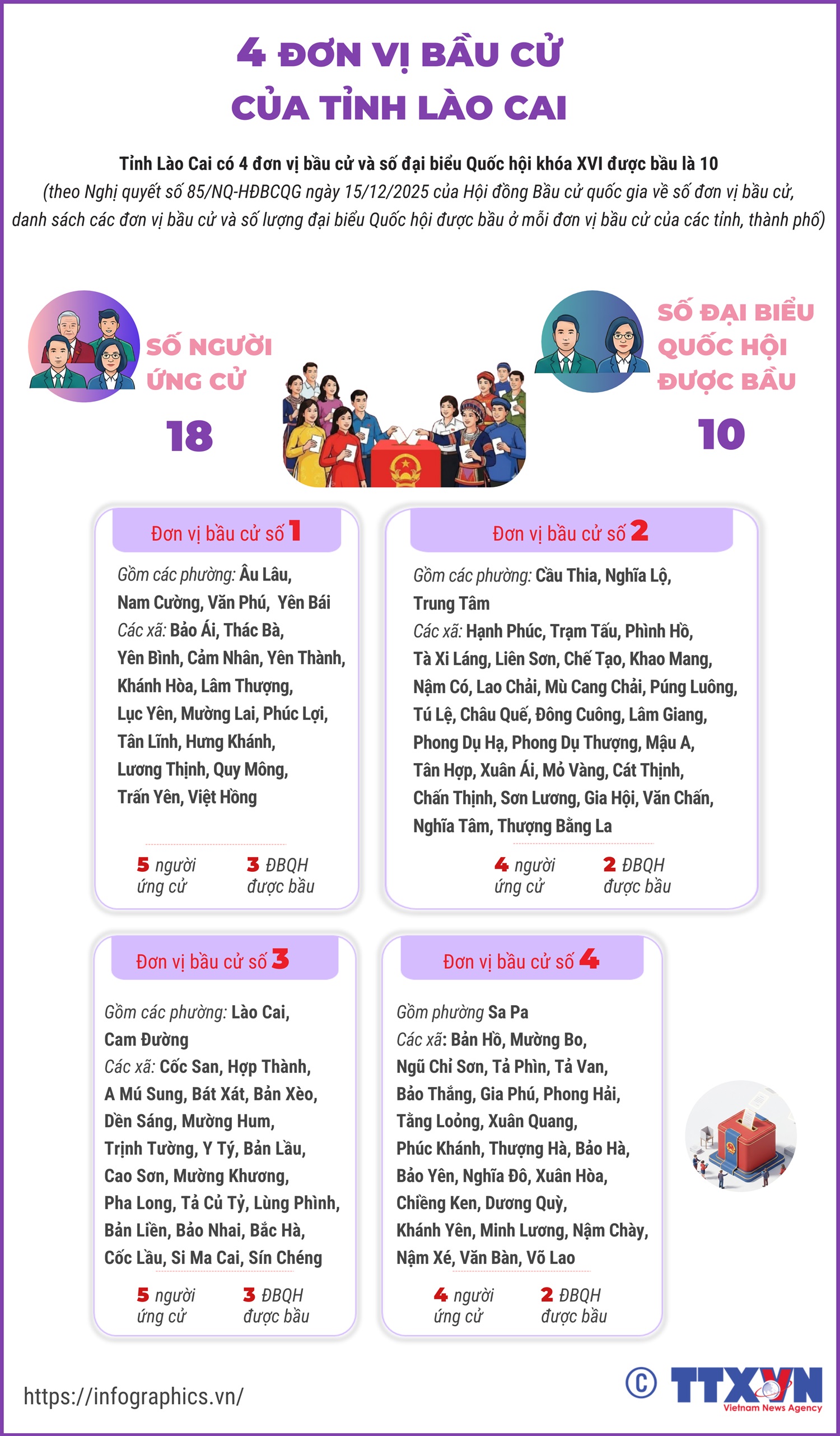 Hà Nội (TTXVN 27/2) Theo Nghị quyết số 85/NQ-HĐBCQG ngày 15/12/2025 của Hội đồng Bầu cử quốc gia về số đơn vị bầu cử, danh sách các đơn vị bầu cử và số lượng đại biểu Quốc hội được bầu ở mỗi đơn vị bầu cử của các tỉnh, thành phố, Lào Cai có 4 đơn vị bầu cử và số đại biểu Quốc hội khóa XVI được bầu là 10.