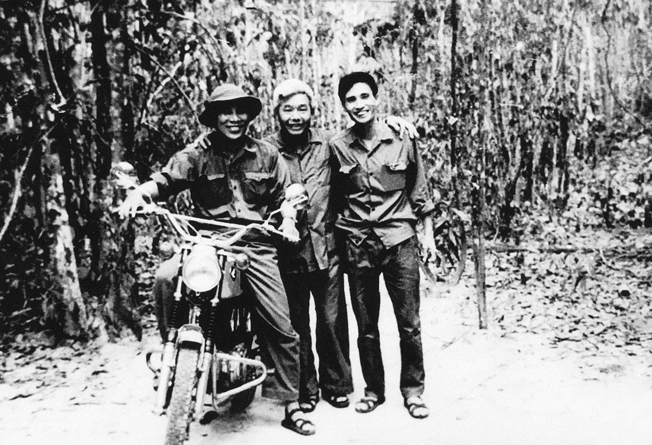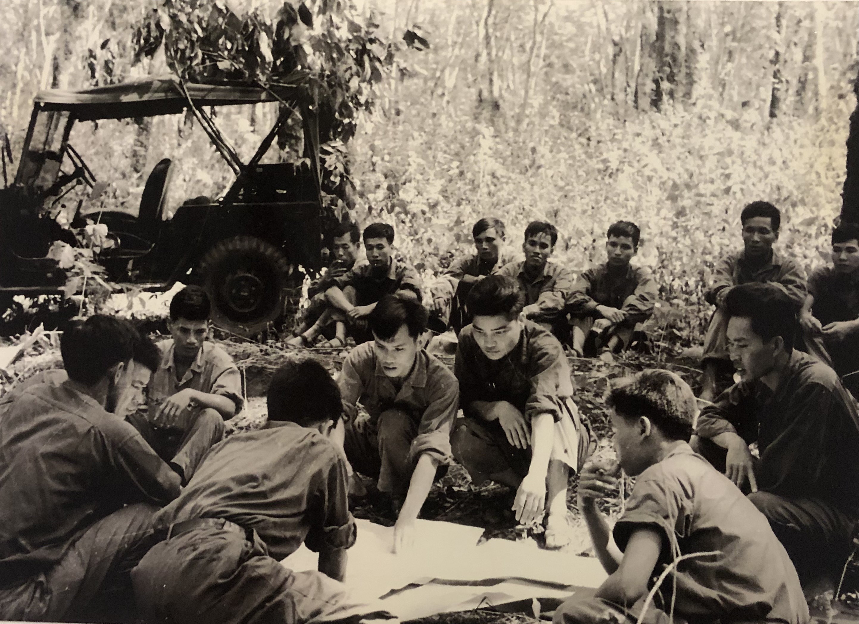 | Giữa đồn điền cao su Ông Quế, Ban chỉ huy Trung đoàn Khe Sanh trải tấm bản đồ do nhà báo TTXVN Đinh Quang Thành tặng để nghiên cứu kỹ càng từng tuyến đường vào Sài Gòn |
