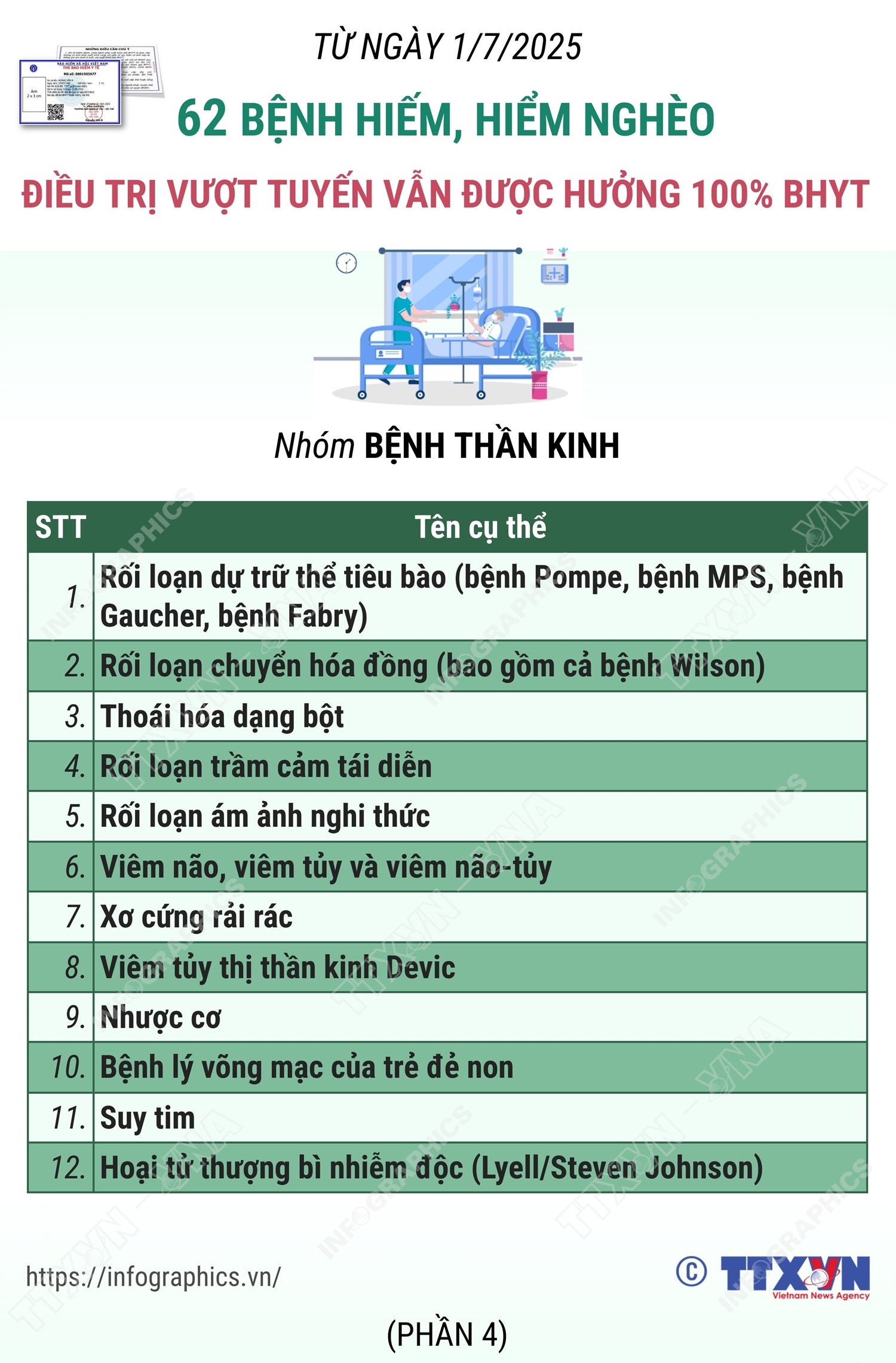 Hà Nội (TTXVN 2/7) Theo Luật sửa đổi, bổ sung một số điều của Luật Bảo hiểm y tế (BHYT), từ 1/7/2025, người tham gia BHYT tự đi khám bệnh, chữa bệnh không đúng cơ sở đăng ký khám bệnh, chữa bệnh BHYT ban đầu, không đúng quy định về chuyển người bệnh quy định tại Điều 26 và Điều 27 của Luật này được thanh toán 100% mức hưởng khi khám bệnh, chữa bệnh tại cơ sở khám bệnh, chữa bệnh cấp cơ bản hoặc cấp chuyên sâu trong trường hợp chẩn đoán xác định, điều trị một số bệnh hiếm, bệnh hiểm nghèo, bệnh cần phẫu thuật hoặc sử dụng kỹ thuật cao do Bộ trưởng Bộ Y tế quy định. Danh mục bệnh hiểm nghèo được quy định tại Thông tư 01/2025/TT-BYT ngày 01/01/2025 của của Bộ Y tế.