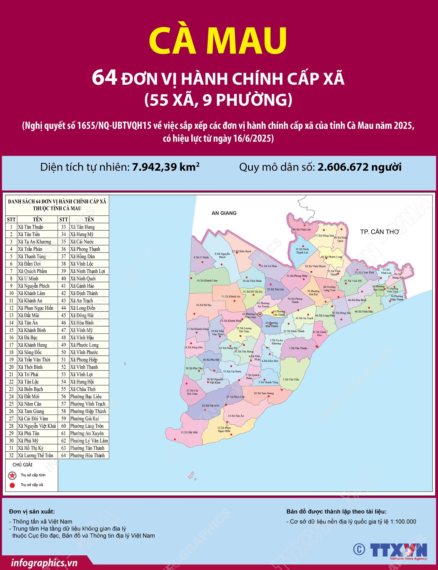 64 đơn vị hành chính cấp xã của tỉnh Cà Mau năm 2025
