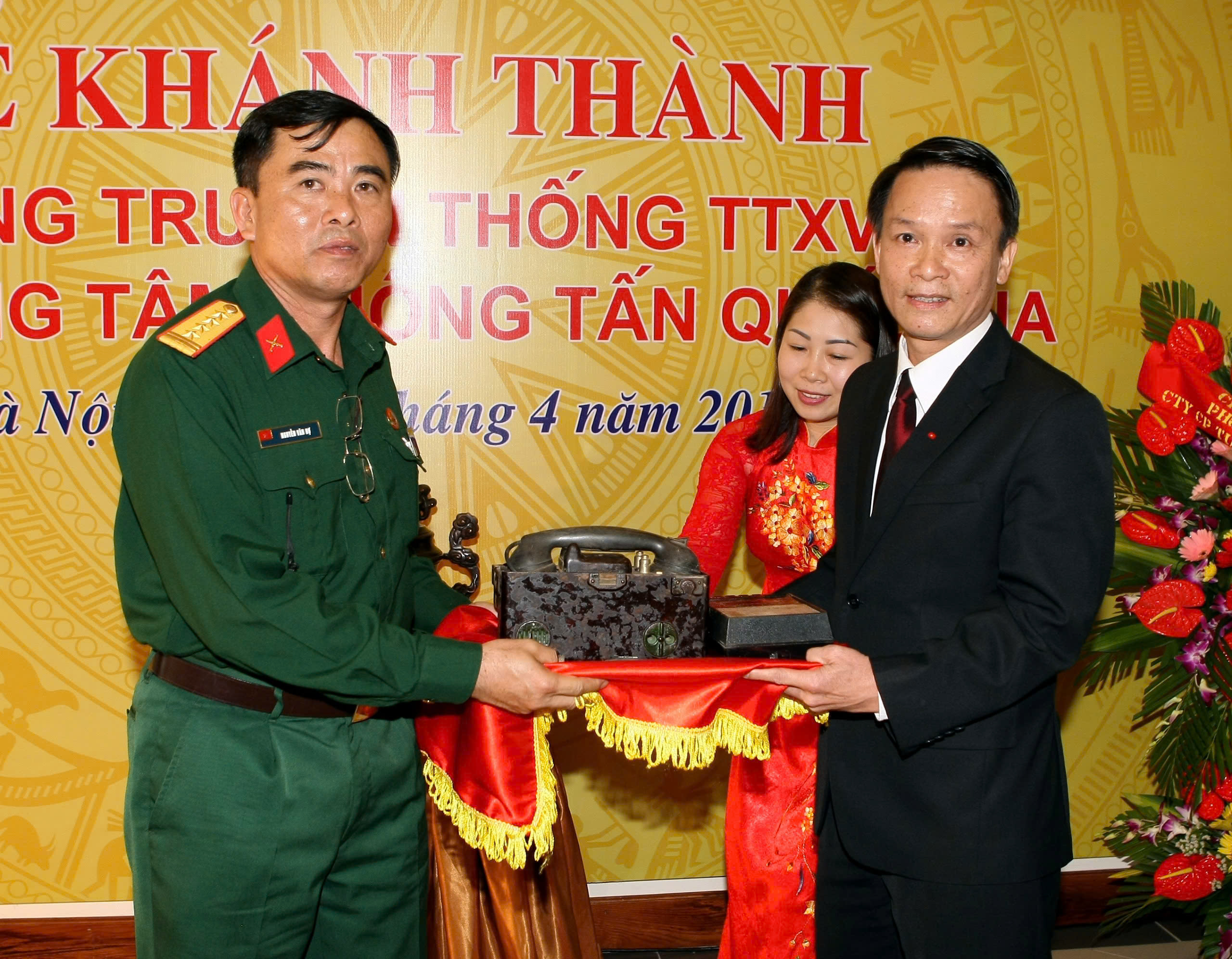 | Đại tá Nguyễn Văn Dự, Sư đoàn trưởng Sư đoàn 304, trao tặng một số kỷ vật nhân dịp khánh thành Phòng truyền thống TTXVN, tháng 4/2015 |