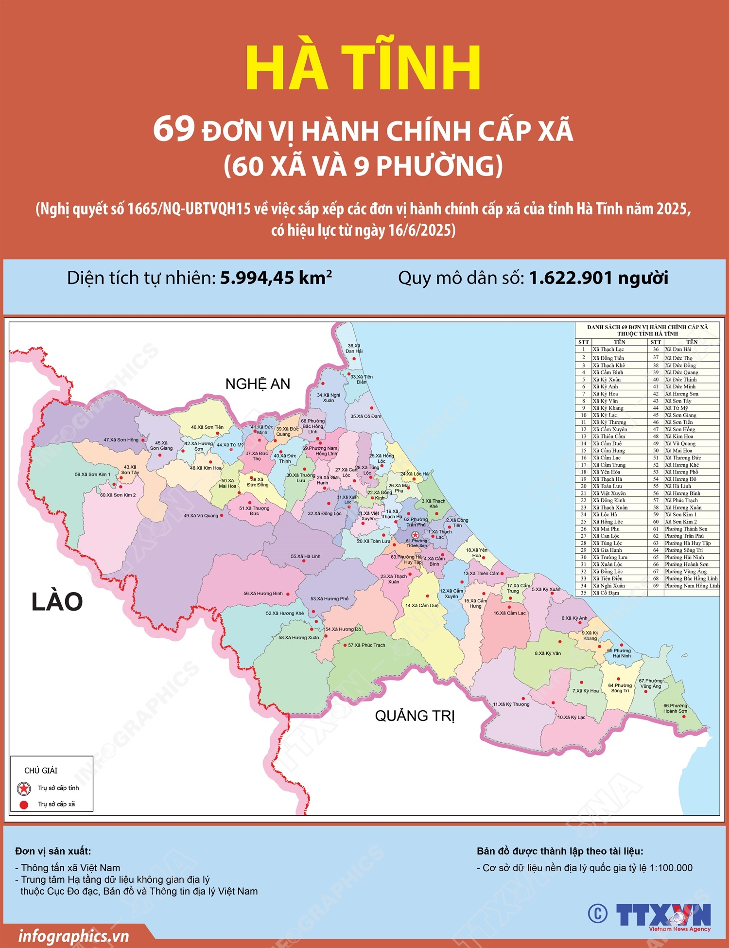 Hà Nội (TTXVN 18/6) Ngày 16/6/2025, thay mặt Ủy ban Thường vụ Quốc hội, Chủ tịch Quốc hội Trần Thanh Mẫn ký Nghị quyết số 1665/NQ-UBTVQH15 về việc sắp xếp các đơn vị hành chính cấp xã của tỉnh Hà Tĩnh năm 2025. Nghị quyết có hiệu lực từ 16/6/2025. Theo đó, sau khi sắp xếp, tỉnh Hà Tĩnh có 69 đơn vị hành chính cấp xã, gồm 60 xã và 09 phường;trong đó có 58 xã, 09 phường hình thành sau sắp xếp quy định tại Điều này và 02 xã không thực hiện sắp xếp là xã Sơn Kim 1 và xã Sơn Kim 2.