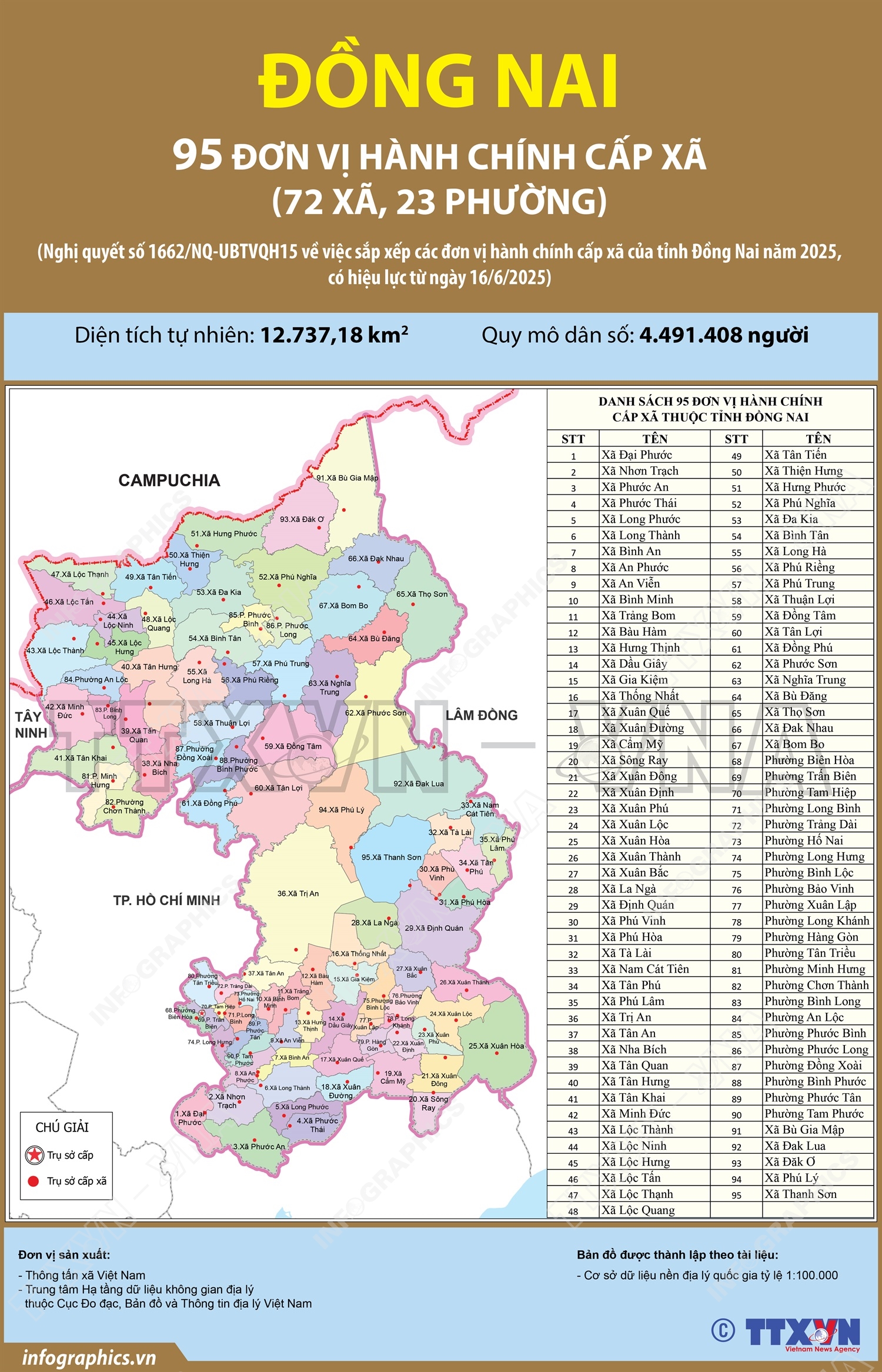 95 đơn vị hành chính cấp xã của tỉnh Đồng Nai năm 2025 Hà Nội (TTXVN 21/6) Ngày 16/6/2025, thay mặt Ủy ban Thường vụ Quốc hội, Chủ tịch Quốc hội Trần Thanh Mẫn ký Nghị quyết số 1662/NQ-UBTVQH15 về việc sắp xếp các đơn vị hành chính cấp xã của tỉnh Đồng Nai năm 2025. Nghị quyết có hiệu lực từ 16/6/2025. Theo đó, sau khi sắp xếp, tỉnh Đồng Nai có 95 đơn vị hành chính cấp xã, gồm 72 xã và 23 phường; trong đó có 67 xã, 21 phường hình thành sau sắp xếp quy định tại Điều này và 07 đơn vị hành chính cấp xã không thực hiện sắp xếp là phường Phước Tân, phường Tam Phước, các xã Thanh Sơn (huyện Định Quán), Đak Lua, Phú Lý, Bù Gia Mập, Đăk Ơ.