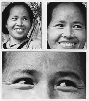 Khi dùng ảnh chân dung, cấm kỵ cắt ngang hàng cằm. Trong trường hợp đặc biệt muốn thu hút độc giả tập trung vào mắt thì cắt hẳn qua hàm của nhân vật trong ảnh. |