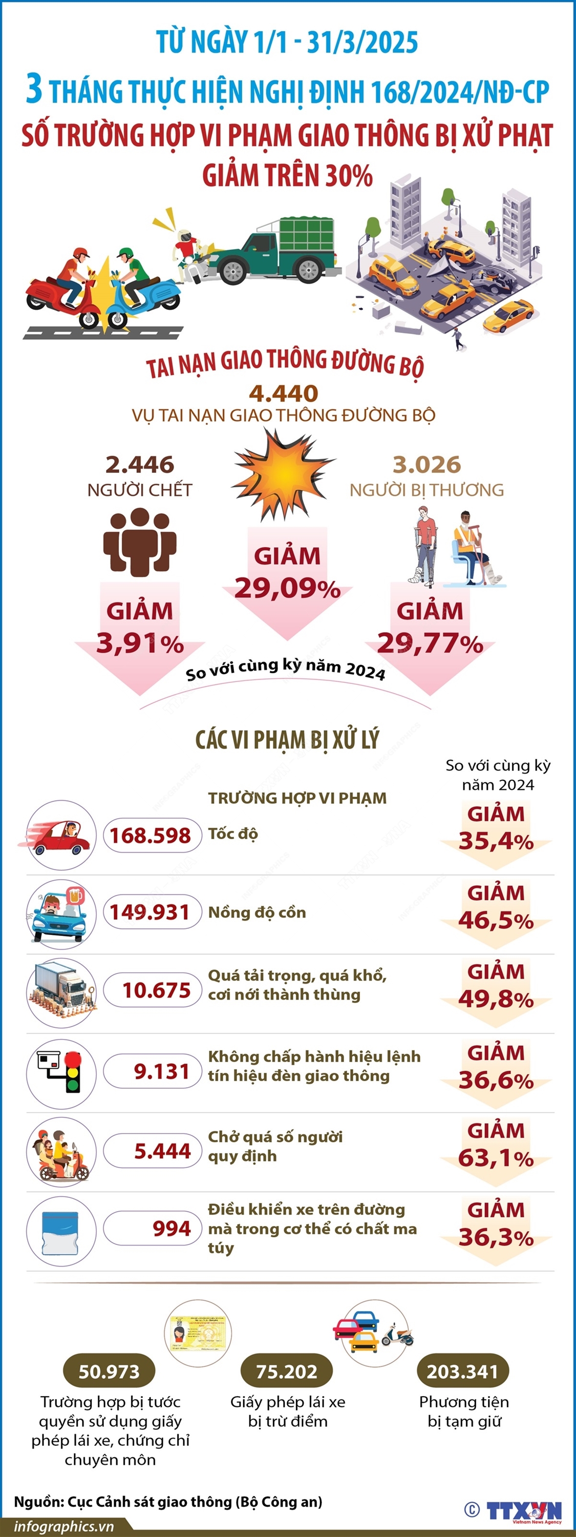 Hà Nội (TTXVN 1/4) Theo thông tin từ Cục Cảnh sát giao thông (Bộ Công an), sau 3 tháng (từ 1/1 - 31/3/2025) thực hiện Nghị định 168/2024/NĐ-CP quy định xử phạt vi phạm hành chính về trật tự, an toàn giao thông trong lĩnh vực giao thông đường bộ; trừ điểm, phục hồi điểm giấy phép lái xe, tình hình tai nạn giao thông có chuyển biến rõ rệt, giảm cả 3 tiêu chí so với cùng kỳ năm 2024. Trong 3 tháng qua, toàn quốc xảy ra 4.440 vụ tai nạn giao thông đường bộ, làm chết 2.446 người, bị thương 3.026 người; so với cùng kỳ năm 2024 giảm 1.821 vụ (29,09%), giảm 245 người chết (3,91%), giảm 1.864 người bị thương (29,77%). Các hành vi vi phạm có mức giảm cao là vi phạm nồng độ cồn, chở quá khổ, quá tải trọng, quá số người quy định…
