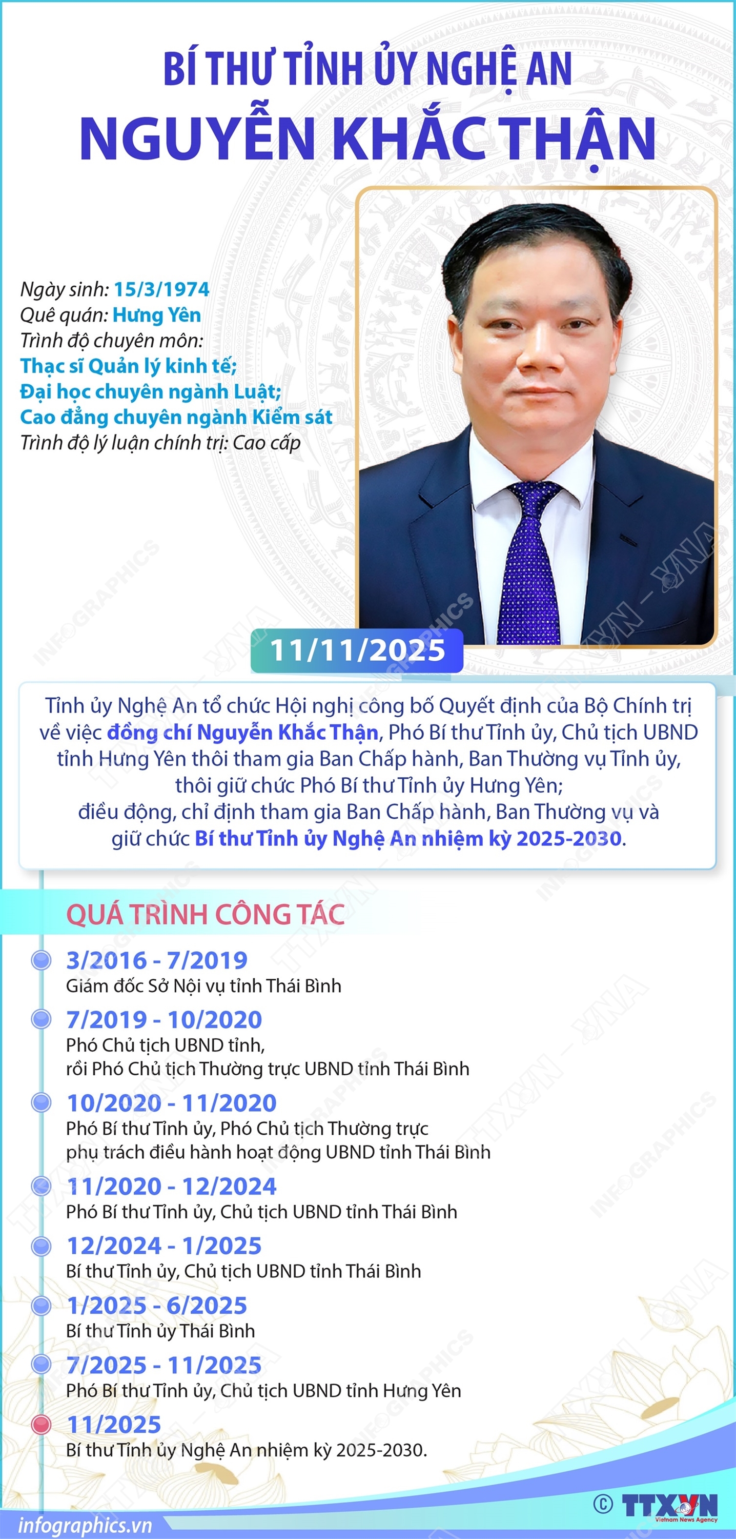 Hà Nội (TTXVN 10/11) Sáng 10/11/2025, Tỉnh ủy Nghệ An tổ chức Hội nghị công bố Quyết định của Bộ Chính trị về việc đồng chí Nguyễn Khắc Thận, Phó Bí thư Tỉnh ủy, Chủ tịch UBND tỉnh Hưng Yên thôi tham gia Ban Chấp hành, Ban Thường vụ Tỉnh ủy, thôi giữ chức Phó Bí thư Tỉnh ủy Hưng Yên; điều động, chỉ định tham gia Ban Chấp hành, Ban Thường vụ và giữ chức Bí thư Tỉnh ủy Nghệ An nhiệm kỳ 2025-2030.