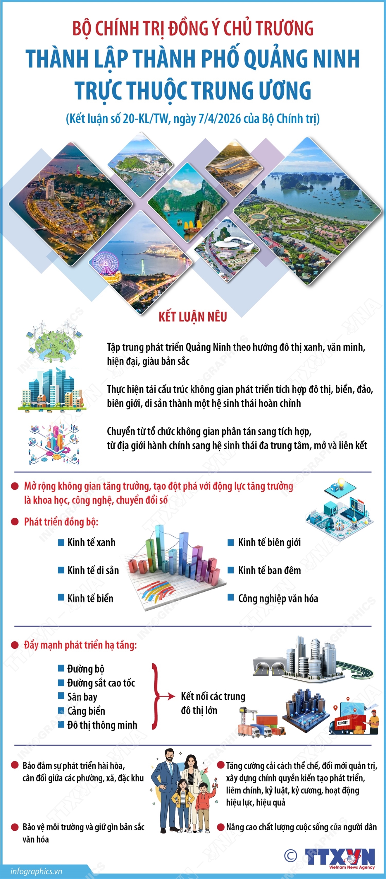 Hà Nội (TTXVN 16/4) Thay mặt Bộ Chính trị, Ủy viên Bộ Chính trị, Thường trực Ban Bí thư Trần Cẩm Tú đã ký Kết luận của Bộ Chính trị về chủ trương thành lập thành phố Quảng Ninh trực thuộc Trung ương trên cơ sở địa giới hành chính tỉnh Quảng Ninh (Kết luận số 20-KL/TW, ngày 7/4/2026). Bộ Chính trị kết luận: Đồng ý chủ trương thành lập thành phố Quảng Ninh trực thuộc Trung ương, trong đó: Tập trung phát triển Quảng Ninh theo hướng đô thị xanh, văn minh, hiện đại, giàu bản sắc; thực hiện tái cấu trúc không gian phát triển tích hợp đô thị, biển, đảo, biên giới, di sản thành một hệ sinh thái hoàn chỉnh; chuyển từ tổ chức không gian phân tán sang tích hợp, từ địa giới hành chính sang hệ sinh thái đa trung tâm, mở và liên kết. Mở rộng không gian tăng trưởng, tạo đột phá với động lực tăng trưởng là khoa học, công nghệ, chuyển đổi số; phát triển đồng bộ kinh tế xanh, kinh tế di sản, kinh tế biển, kinh tế biên giới, kinh tế ban đêm, công nghiệp văn hóa. Đẩy mạnh phát triển hạ tầng đường bộ, đường sắt cao tốc, sân bay, cảng biển và hạ tầng đô thị thông minh, kết nối các trung tâm đô thị lớn. Bảo đảm sự phát triển hài hoà, cân đối giữa các phường, xã, đặc khu; bảo vệ môi trường và giữ gìn bản sắc văn hóa. Tăng cường cải cách thể chế, đổi mới quản trị, xây dựng chính quyền kiến tạo phát triển, liêm chính, kỷ luật, kỷ cương, hoạt động hiệu lực, hiệu quả; nâng cao chất lượng cuộc sống của người dân.