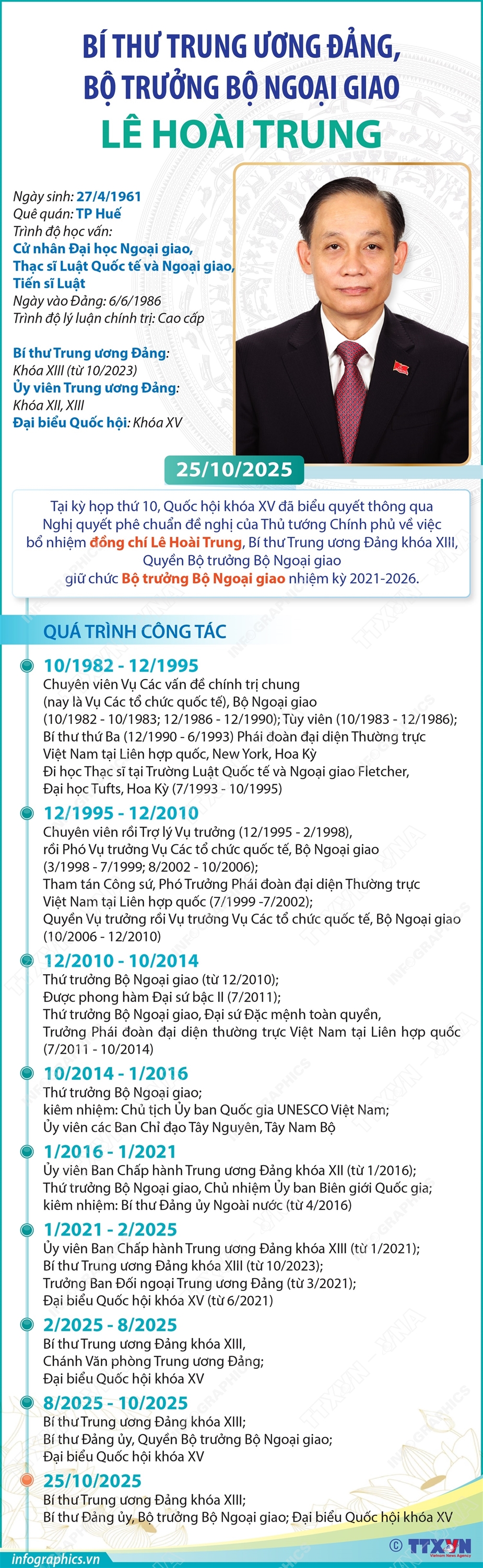 Hà Nội (TTXVN 25/10) Kỳ họp thứ 10 Quốc hội khóa XV đã biểu quyết thông qua Nghị quyết phê chuẩn đề nghị của Thủ tướng Chính phủ về việc bổ nhiệm đồng chí Lê Hoài Trung, Bí thư Trung ương Đảng khóa XIII, Quyền Bộ trưởng Bộ Ngoại giao giữ chức Bộ trưởng Bộ Ngoại giao nhiệm kỳ 2021-2026.