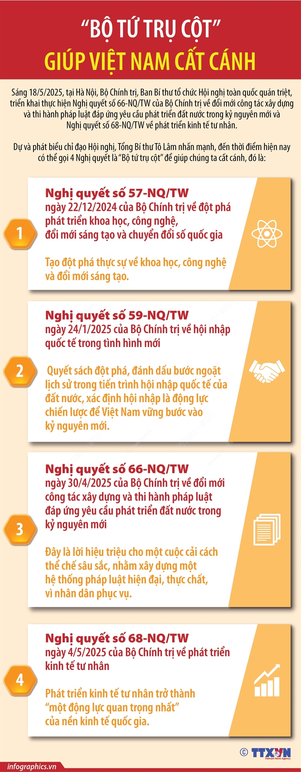 Hà Nội (TTXVN 19/5) Sáng 18/5/2025, tại Hà Nội, Bộ Chính trị, Ban Bí thư tổ chức Hội nghị toàn quốc quán triệt, triển khai thực hiện Nghị quyết số 66-NQ/TW của Bộ Chính trị về đổi mới công tác xây dựng và thi hành pháp luật đáp ứng yêu cầu phát triển đất nước trong kỷ nguyên mới và Nghị quyết số 68-NQ/TW về phát triển kinh tế tư nhân. Dự và phát biểu chỉ đạo Hội nghị, Tổng Bí thư Tô Lâm nhấn mạnh, đến thời điểm hiện nay, có thể gọi 4 Nghị quyết là “Bộ tứ trụ cột” để giúp chúng ta cất cánh. Đó là: Nghị quyết số 57-NQ/TW ngày 22/12/2024 của Bộ Chính trị về đột phá phát triển khoa học, công nghệ, đổi mới sáng tạo và chuyển đổi số quốc gia; Nghị quyết 59-NQ/TW ngày 24/1/2025 của Bộ Chính trị về “Hội nhập quốc tế trong tình hình mới”; Nghị quyết số 68- NQ/TW ngày 4/5/2025 của Bộ Chính trị về phát triển kinh tế tư nhân và Nghị quyết số 66-NQ/TW về đổi mới công tác xây dựng và thi hành pháp luật đáp ứng yêu cầu phát triển đất nước trong kỷ nguyên mới.