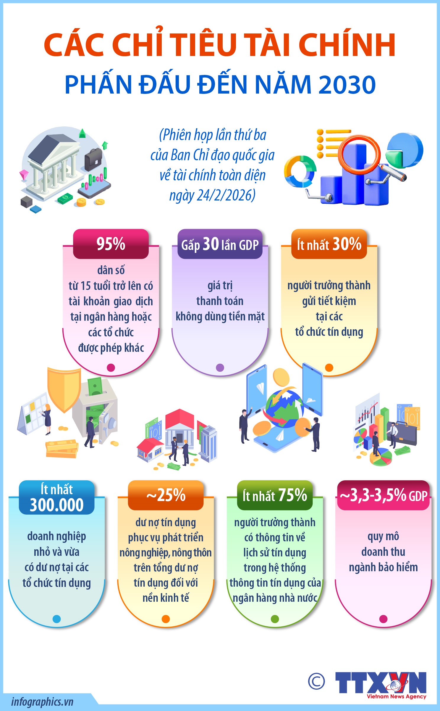 Hà Nội (TTXVN 26/2) Về Chiến lược tài chính giai đoạn 2026-2030, Phiên họp nêu rõ mục tiêu lớn nhất là bảo đảm tiến bộ, công bằng xã hội, tiếp cận bình đẳng các dịch vụ tài chính ngân hàng, người dân, doanh nghiệp là trung tâm, là chủ thể, vừa tham gia, vừa thụ hưởng thành quả thực hiện Chiến lược. Mục tiêu tổng quát là: Hình thành hệ sinh thái tài chính toàn diện hiện đại, an toàn và bao trùm, góp phần nâng cao đời sống của người dân, đảm bảo không ai bị bỏ lại phía sau trong quá trình phát triển; phấn đấu mọi người dân và doanh nghiệp, nhất là nhóm đối tượng ưu tiên được tiếp cận một cách bình đẳng, toàn diện các sản phẩm, dịch vụ tài chính, hưởng thụ đầy đủ các thành quả từ Chiến lược, góp phần đảm bảo tiến bộ, công bằng xã hội và an sinh xã hội trong quá trình phát triển.