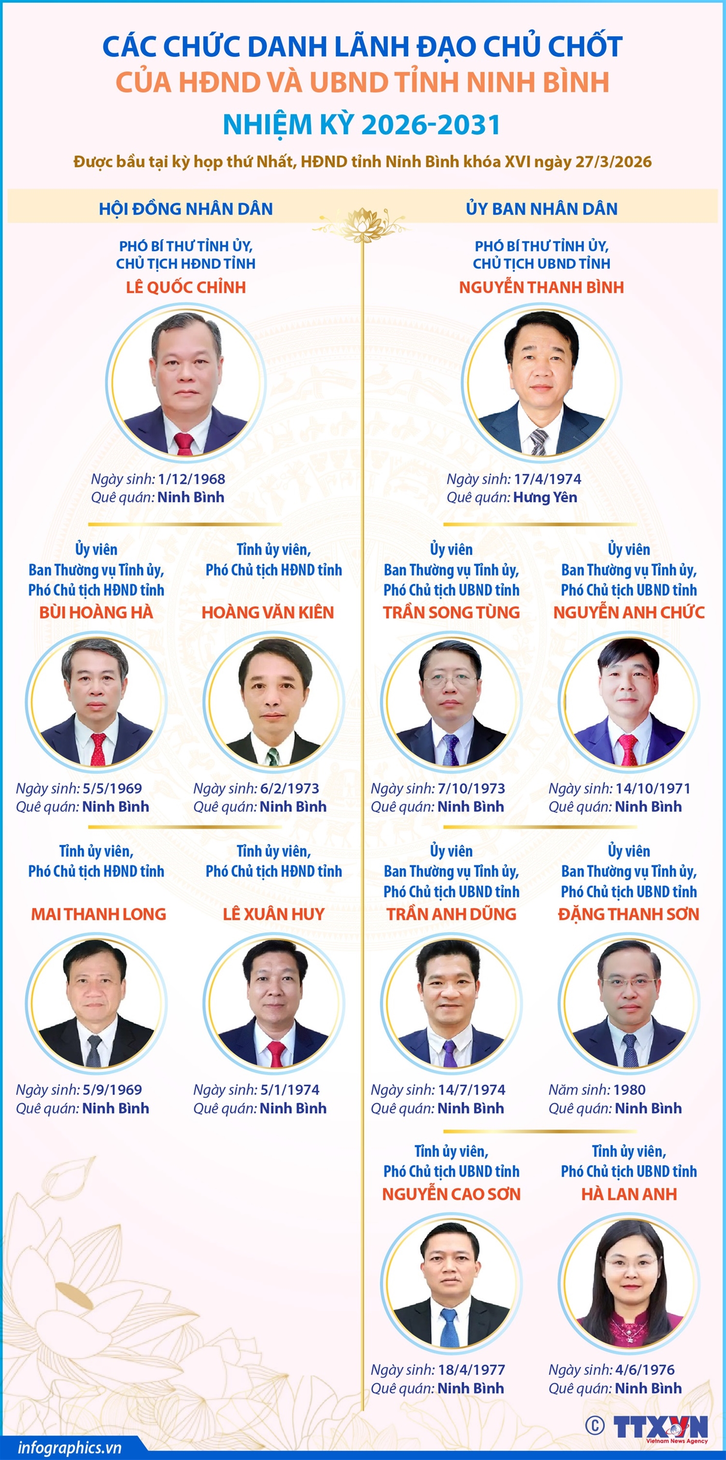 Hà Nội (TTXVN 29/3) Ngày 27/3/2026, tại kỳ họp thứ Nhất, HĐND tỉnh Ninh Bình khóa XVI đã bầu đồng chí Lê Quốc Chỉnh, Phó Bí thư Tỉnh ủy giữ chức Chủ tịch HĐND tỉnh khóa XVI, nhiệm kỳ 2026-2031. Phó Chủ tịch tỉnh Ninh Bình khóa XVI, nhiệm kỳ 2026-2031 gồm các đồng chí: Bùi Hoàng Hà; Mai Thanh Long; Hoàng Văn Kiên, Lê Xuân Huy. Cũng tại kỳ họp, HĐND tỉnh Ninh Bình đã bầu đồng chí Nguyễn Thanh Bình, Phó Bí thư Tỉnh ủy giữ chức Chủ tịch UBND tỉnh khóa XVI, nhiệm kỳ 2026-2031. Phó Chủ tịch UBND tỉnh Ninh Bình khóa XVI, nhiệm kỳ 2026-2031 gồm các đồng chí: Trần Song Tùng; Nguyễn Anh Chức; Trần Anh Dũng; Đặng Thanh Sơn; Nguyễn Cao Sơn; Hà Lan Anh.