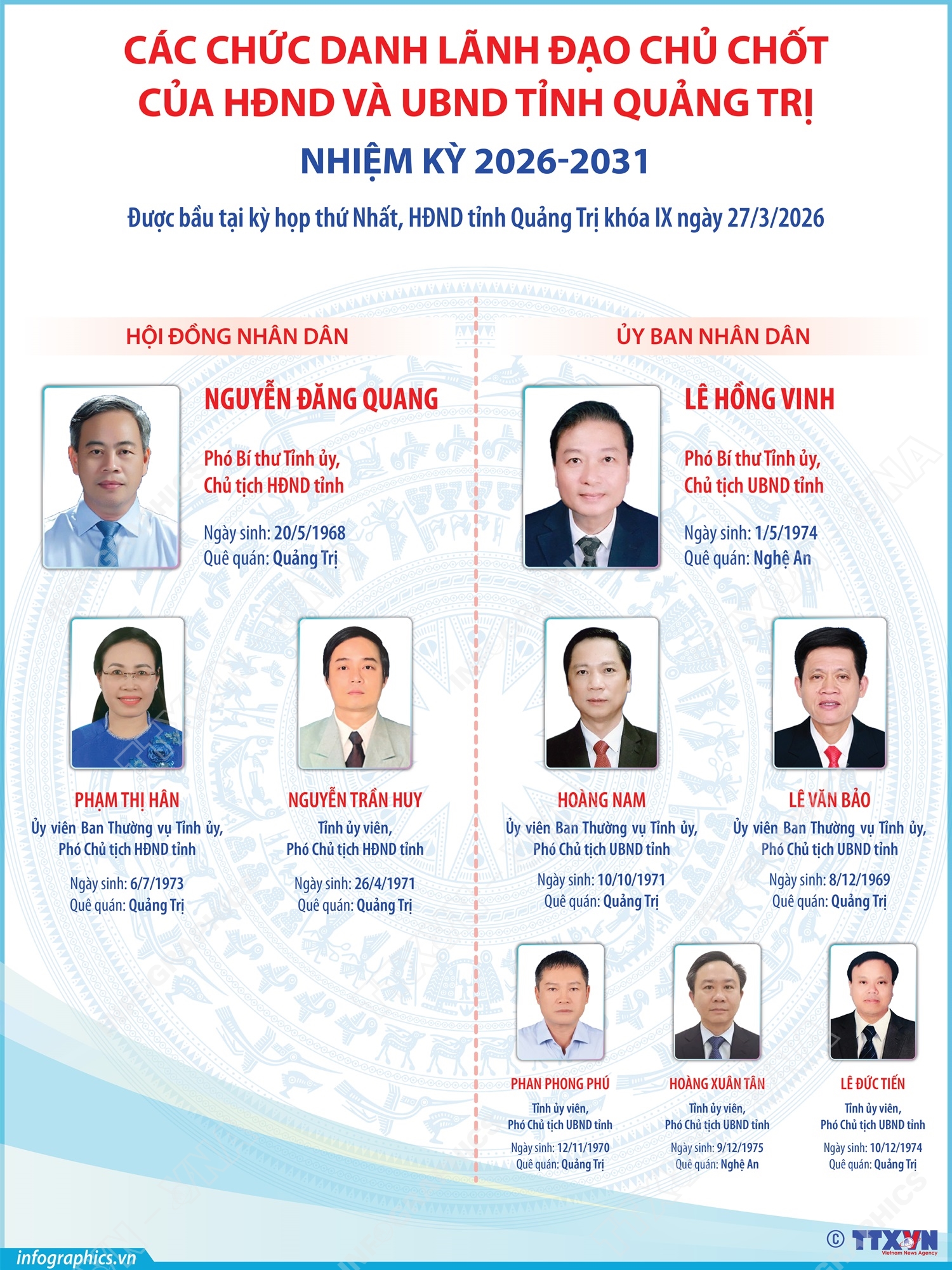 Hà Nội (TTXVN 28/3) Ngày 27/3/2026, tại kỳ họp thứ Nhất, HĐND tỉnh Quảng Trị khóa IX đã bầu đồng chí Nguyễn Đăng Quang, Phó Bí thư Tỉnh ủy, Chủ tịch HĐND tỉnh khóa VIII, nhiệm kỳ 2021-2026 giữ chức Chủ tịch HĐND tỉnh khóa IX, nhiệm kỳ 2026-2031. Phó Chủ tịch tỉnh Quảng Trị khóa IX, nhiệm kỳ 2026-2031 gồm các đồng chí: Phạm Thị Hân, Nguyễn Trần Huy. Cũng tại kỳ họp, HĐND tỉnh đã bầu đồng chí Lê Hồng Vinh, Phó Bí thư Tỉnh ủy, Chủ tịch UBND tỉnh khóa VIII, nhiệm kỳ 2021-2026 giữ chức Chủ tịch UBND tỉnh khóa IX, nhiệm kỳ 2026-2031. Phó Chủ tịch UBND tỉnh Quảng Trị khóa IX, nhiệm kỳ 2026-2031 gồm các đồng chí: Hoàng Nam, Lê Văn Bảo, Phan Phong Phú, Hoàng Xuân Tân, Lê Đức Tiến.