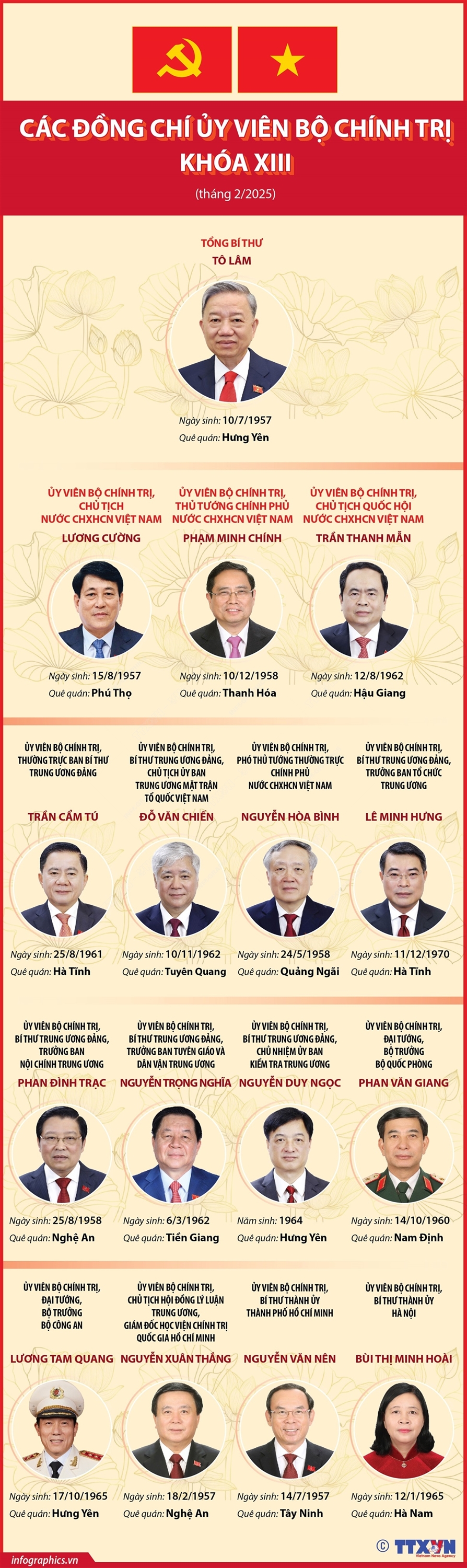 Các đồng chí Ủy viên Bộ Chính trị khóa XIII (tháng 2/2025)