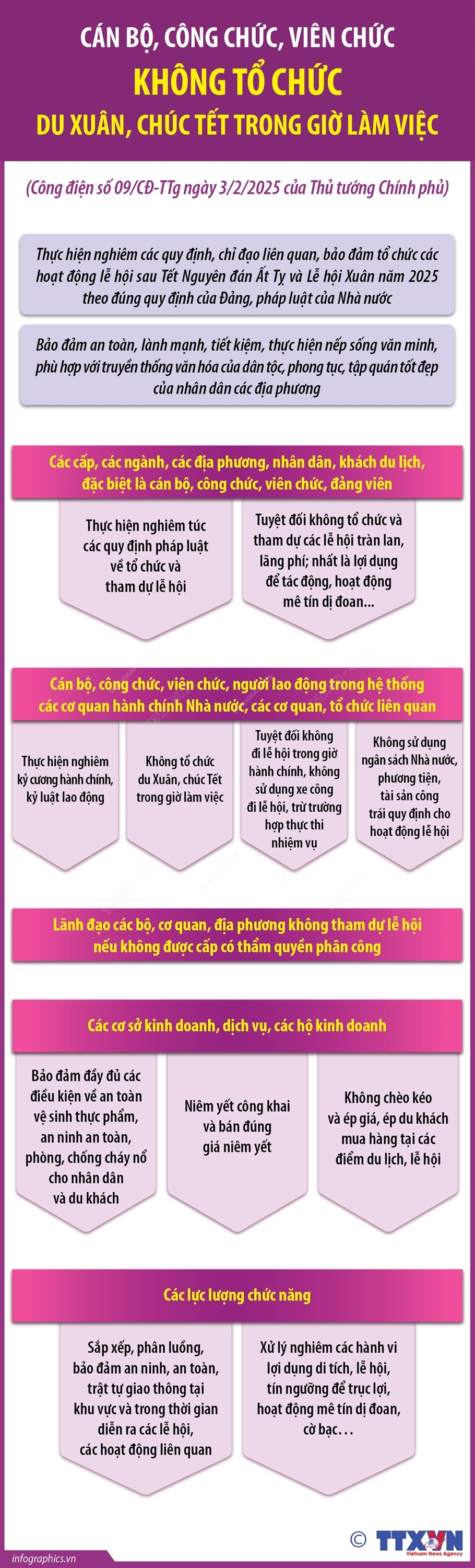 Thủ tướng Chính phủ Phạm Minh Chính ký Công điện số 09/CĐ-TTg ngày 3/2/2025 yêu cầu các Bộ ngành, địa phương bảo đảm thực hiện nếp sống văn minh, an toàn, tiết kiệm trong các hoạt động lễ hội sau Tết Nguyên đán Ất Tỵ và Lễ hội Xuân năm 2025. Công điện nêu: Trong dịp Tết, sau Tết Nguyên đán Ất Tỵ và Lễ hội xuân năm 2025 đã và đang diễn ra nhiều hoạt động lễ hội thu hút đông đảo Nhân dân tham dự ở các địa phương trên cả nước. Để tiếp tục thực hiện nghiêm các quy định, chỉ đạo liên quan, bảo đảm tổ chức các hoạt động lễ hội sau Tết Nguyên đán Ất Tỵ và Lễ hội xuân năm 2025 theo đúng quy định của Đảng, pháp luật của Nhà nước, bảo đảm an toàn, lành mạnh, tiết kiệm, thực hiện nếp sống văn minh, phù hợp với truyền thống văn hóa của dân tộc và phong tục, tập quán tốt đẹp của Nhân dân các địa phương, Thủ tướng Chính phủ yêu cầu cán bộ, công chức, viên chức, người lao động tuyệt đối không đi lễ hội Xuân trong giờ hành chính, không sử dụng xe công đi lễ hội trừ trường hợp thực thi nhiệm vụ...