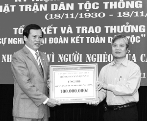 Ngày 17/11 tại Hà Nội, trong Lễ kỷ niệm 81 năm ngày thành lập Mặt trận Dân tộc thống nhất Việt Nam (18/11/1930 - 2011) do Ủy ban Trung ương Mặt trận Tổ quốc (MTTQ) Việt Nam tổ chức, đồng chí Mai Quang Huy, Chủ tịch Công đoàn TTXVN đã trao số tiền này cho lãnh đạo Ủy ban Trung ương MTTQ VN (ảnh).