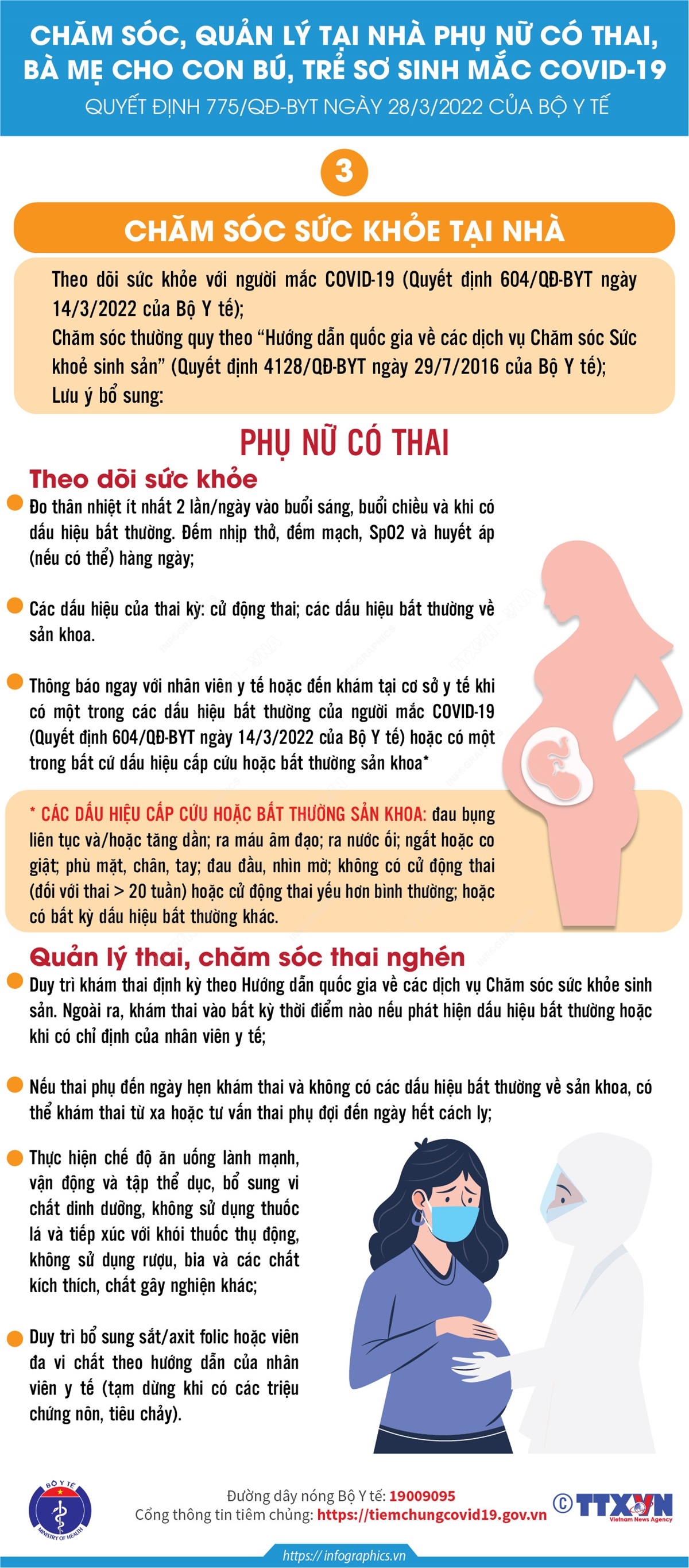 Khi chăm sóc sức khỏe phụ nữ có thai mắc COVID-19 tại nhà cần chú ý theo dõi sức khỏe, các dấu hiệu cấp cứu hoặc bất thường sản khoa, quản lý thai và chăm sóc thai nghén.