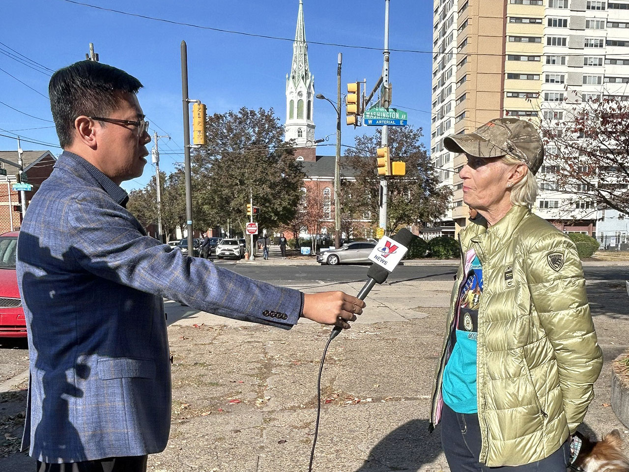 Trưởng CQTT TTXVN tại New York Trần Thanh Tuấn phỏng vấn cử tri tiểu bang Pennsylvania, tháng 11/2024 |