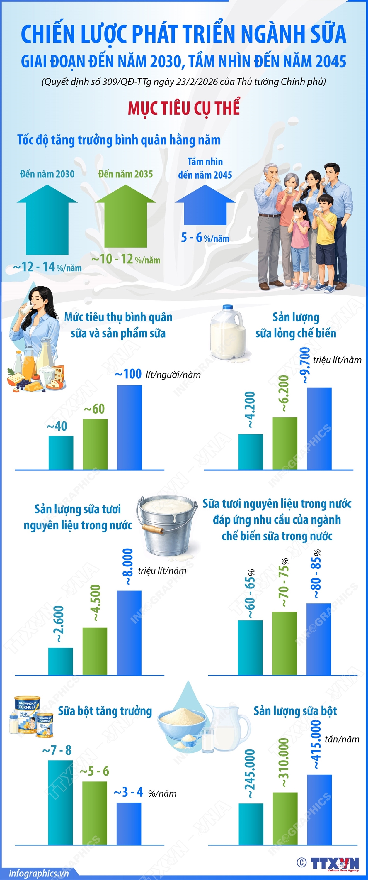 Hà Nội (TTXVN 7/3) Quyết định số 309/QĐ-TTg ngày 23/2/2026 của Thủ tướng Chính phủ phê duyệt Chiến lược phát triển ngành sữa giai đoạn đến năm 2030, tầm nhìn đến năm 2045 đặt mục tiêu xây dựng ngành công nghiệp chế biến sữa Việt Nam phát triển bền vững với chuỗi giá trị ngành sữa hoàn chỉnh từ khâu phát triển đàn bò sữa, tăng sản lượng sữa tươi nguyên liệu đến chế biến thành phẩm giá trị gia tăng cao. Ngành sữa đáp ứng cơ bản nhu cầu ngày càng cao của thị trường trong nước và tham gia ngày càng sâu trong chuỗi giá trị, chuỗi cung ứng sữa khu vực và toàn cầu.