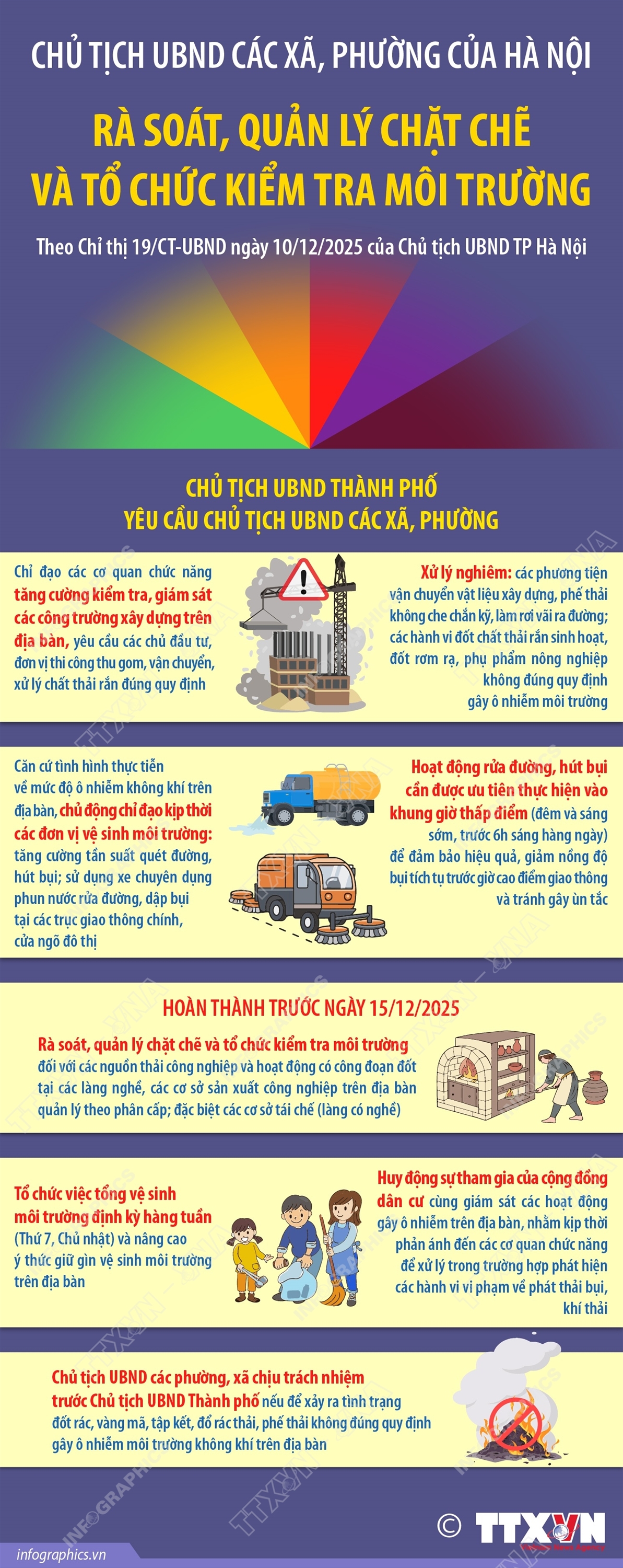 Hà Nội (TTXVN 12/12) Những ngày gần đây, thời tiết cực đoan (mây mù dày, nhiệt độ thấp, nghịch nhiệt) khiến Chỉ số Chất lượng Không khí (AQI) của thành phố Hà Nội ở mức “xấu” và “rất xấu”, ảnh hưởng đến sức khỏe người dân và hoạt động kinh tế - xã hội. Trước tình hình này, Chủ tịch UBND TP Hà Nội ra Chỉ thị số 19/CT-UBND, trong đó yêu cầu Chủ tịch UBND các xã, phường: Chỉ đạo các cơ quan chức năng tăng cường kiểm tra, giám sát các công trường xây dựng trên địa bàn, yêu cầu các chủ đầu tư, đơn vị thi công thu gom, vận chuyển, xử lý chất thải rắn đúng quy định; xử lý nghiêm: các phương tiện vận chuyển vật liệu xây dựng, phế thải không che chắn kỹ, làm rơi vãi ra đường; các hành vi đốt chất thải rắn sinh hoạt, đốt rơm rạ, phụ phẩm nông nghiệp không đúng quy định gây ô nhiễm môi trường… Chủ tịch UBND xã, phường chịu trách nhiệm trước Chủ tịch UBND TP nếu để xảy ra tình trạng đốt rác, vàng mã, tập kết, đổ rác thải, phế thải không đúng quy định gây ô nhiễm môi trường không khí trên địa bàn.
