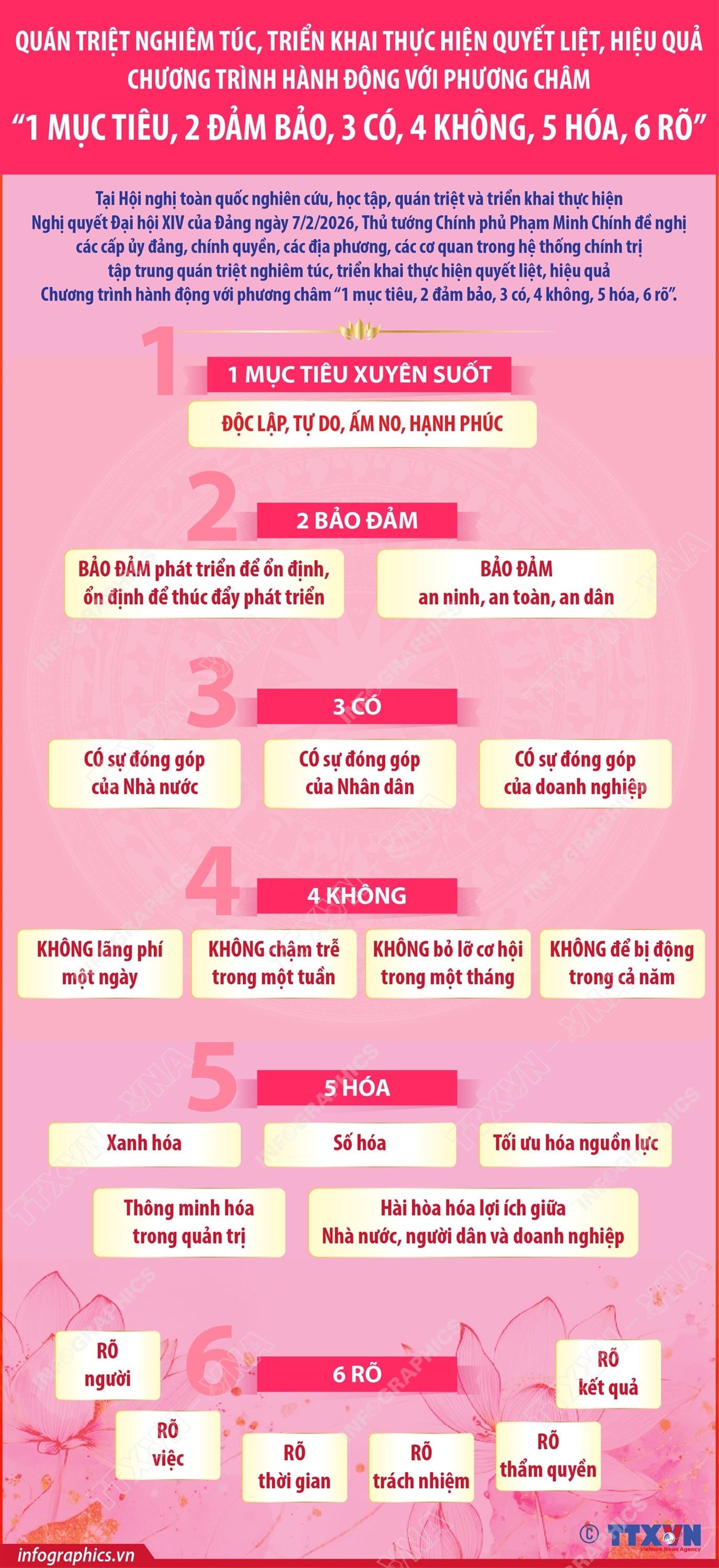 Hà Nội (TTXVN 7/2) Tại Hội nghị toàn quốc nghiên cứu, học tập, quán triệt và triển khai thực hiện Nghị quyết Đại hội XIV của Đảng ngày 7/2/2026, Thủ tướng Chính phủ Phạm Minh Chính đề nghị các cấp ủy đảng, chính quyền, các địa phương, các cơ quan trong hệ thống chính trị tập trung quán triệt nghiêm túc, triển khai thực hiện quyết liệt, hiệu quả Chương trình hành động với phương châm “1 mục tiêu, 2 đảm bảo, 3 có, 4 không, 5 hóa, 6 rõ”.