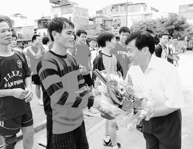 Chủ tịch Công đoàn TTXVN Hà Mùi tặng hoa cho các VĐV tham gia Hội khỏe toàn ngành năm 2008 |