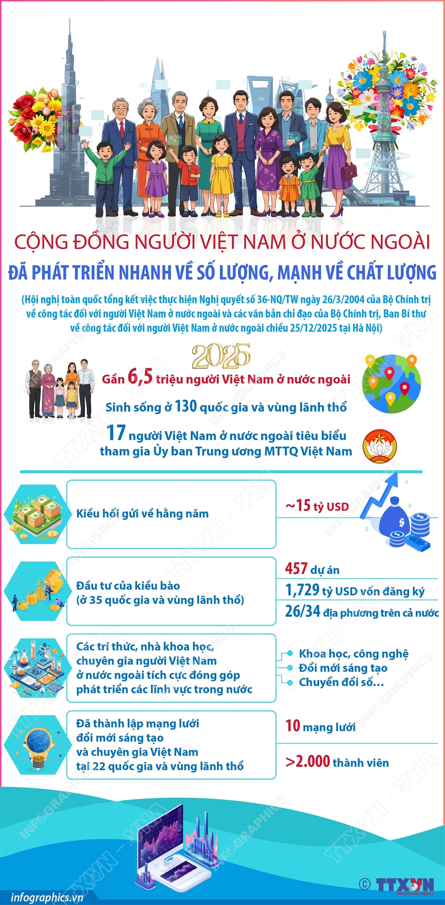 Hà Nội (TTXVN 29/12) Hội nghị toàn quốc tổng kết việc thực hiện Nghị quyết số 36-NQ/TW ngày 26/3/2004 của Bộ Chính trị về công tác đối với người Việt Nam ở nước ngoài và các văn bản chỉ đạo của Bộ Chính trị, Ban Bí thư về công tác đối với người Việt Nam ở nước ngoài diễn ra chiều 25/12/2025, tại Hà Nội. Kết quả sau hơn 20 năm thực hiện Nghị quyết, Đảng và Nhà nước ngày càng quan tâm, tạo điều kiện để cộng đồng người Việt Nam ở nước ngoài phát triển. Sự gắn bó giữa Đảng, Nhà nước và nhân dân trong nước với đồng bào ta ở nước ngoài ngày càng được củng cố, chặt chẽ và thực chất hơn. Cộng đồng người Việt Nam ở nước ngoài đã phát triển mạnh cả "về lượng và chất". Từ khoảng 2,7 triệu người ở gần 90 quốc gia và vùng lãnh thổ năm 2004, đến nay đã có gần 6,5 triệu người Việt Nam ở nước ngoài tại trên 130 quốc gia và vùng lãnh thổ. Hiện, có 17 cá nhân người Việt Nam ở nước ngoài tiêu biểu tham gia Ủy ban Trung ương Mặt trận Tổ quốc Việt Nam. Hằng năm kiều bào gửi về nước khoảng 15 tỷ USD kiều hối. Bà con từ 35 quốc gia và vùng lãnh thổ đã đầu tư về nước 457 dự án, với tổng vốn đăng ký 1,729 tỷ USD tại 26/34 địa phương trên cả nước…