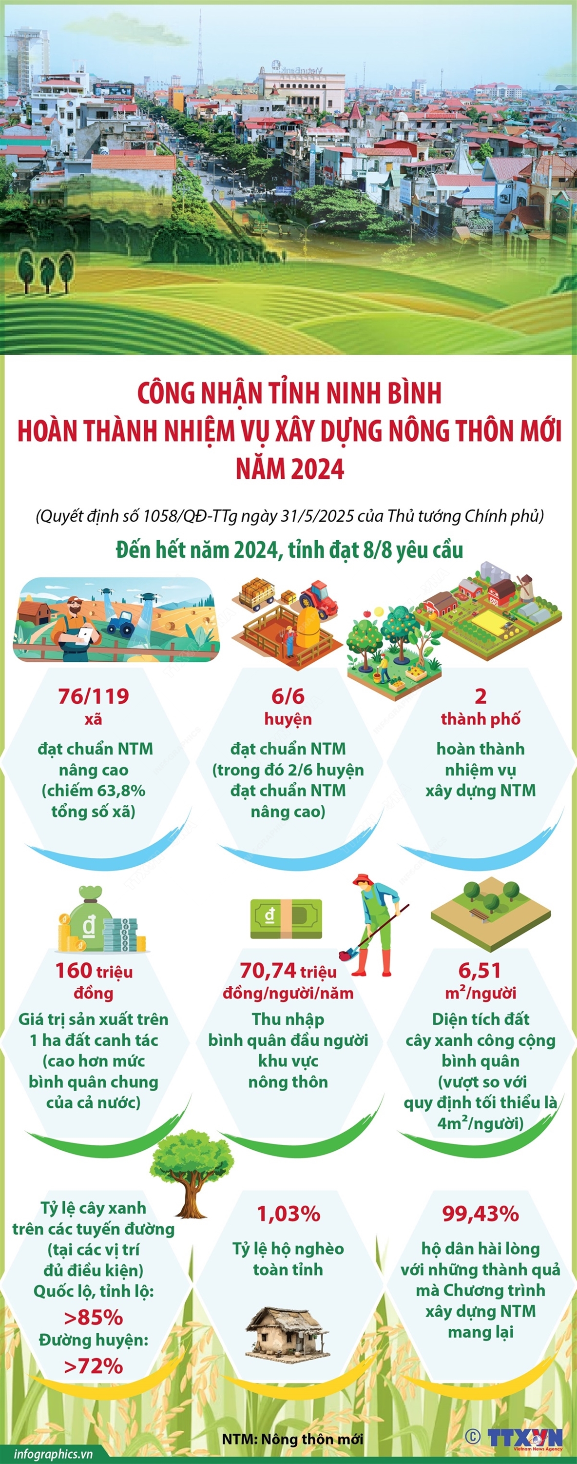 Hà Nội (TTXVN 3/6) Tại Quyết định số 1058/QĐ-TTg ngày 31/5/2025, Thủ tướng Chính phủ công nhận tỉnh Ninh Bình hoàn thành nhiệm vụ xây dựng nông thôn mới năm 2024. Từ năm 2011, tỉnh Ninh Bình đã triển khai Chương trình mục tiêu quốc gia xây dựng nông thôn mới một cách quyết liệt. Tính đến hết năm 2024, tỉnh Ninh Bình đã đạt 8/8 yêu cầu của tỉnh hoàn thành nhiệm vụ xây dựng nông thôn mới. Chương trình mục tiêu quốc gia xây dựng nông thôn mới đã thay đổi đáng kể diện mạo nông thôn Ninh Bình. Hạ tầng kinh tế - xã hội được đầu tư đồng bộ và hoàn thiện. Đời sống của người dân ngày càng được nâng cao. Công tác bảo vệ môi trường nông thôn có những bước tiến vượt bậc, tạo nên cảnh quan xanh, sạch, đẹp. Theo kết quả khảo sát, có tới 99,43% số hộ dân hài lòng với những thành quả mà Chương trình xây dựng nông thôn mới mang lại.