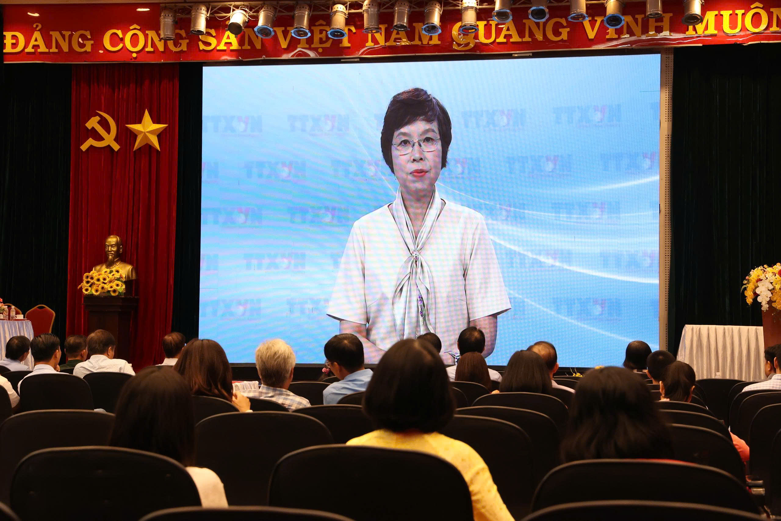 | Bí thư Đảng ủy, Tổng giám đốc, Chủ tịch Liên chi hội nhà báo TTXVN Vũ Việt Trang phát biểu trực tuyến tại Đại hội Chi hội nhà báo Trung tâm Thông tin TTXXVN khu vực phía Nam, ngày 8/4 |