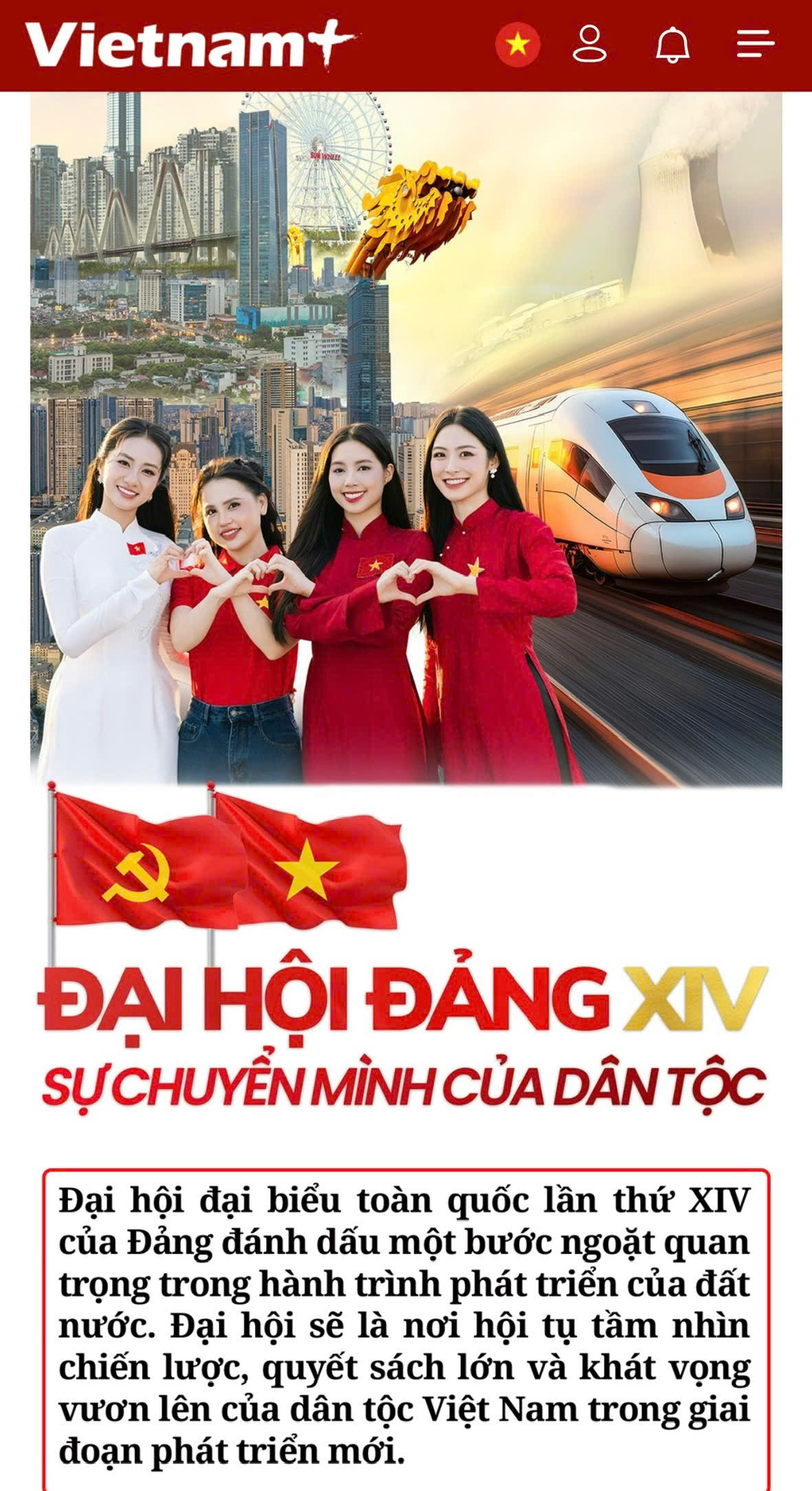 Sáng 12/1, Báo điện tử VietnamPlus ra mắt trang tương tác “Đại hội Đảng XIV: Sự chuyển mình của dân tộc” - sản phẩm thông tin tương tác đa phương tiện đặc sắc thực hiện nhân dịp Đại hội đại biểu toàn quốc lần thứ XIV của Đảng. Tác phẩm được xây dựng như một không gian thông tin chuyên sâu, hiện đại, ghi lại dấu mốc đặc biệt quan trọng của đất nước trong giai đoạn phát triển mới.