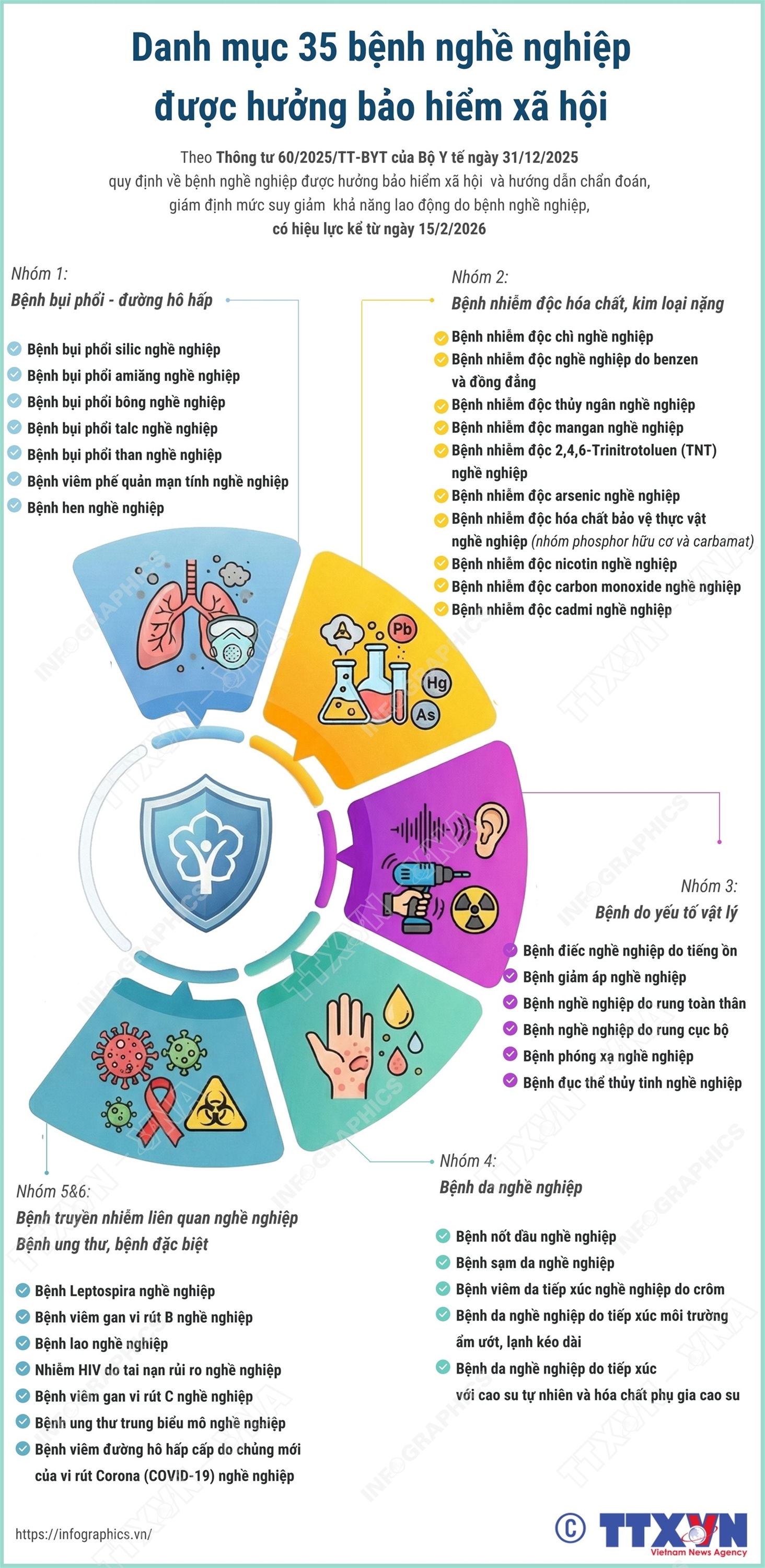 Hà Nội (TTXVN 15/2) Theo Thông tư 60/2025/TT-BYT ngày 31/12/2025 của Bộ Y tế, từ 15/2/2025, có 35 bệnh nghề nghiệp được hưởng bảo hiểm xã hội.