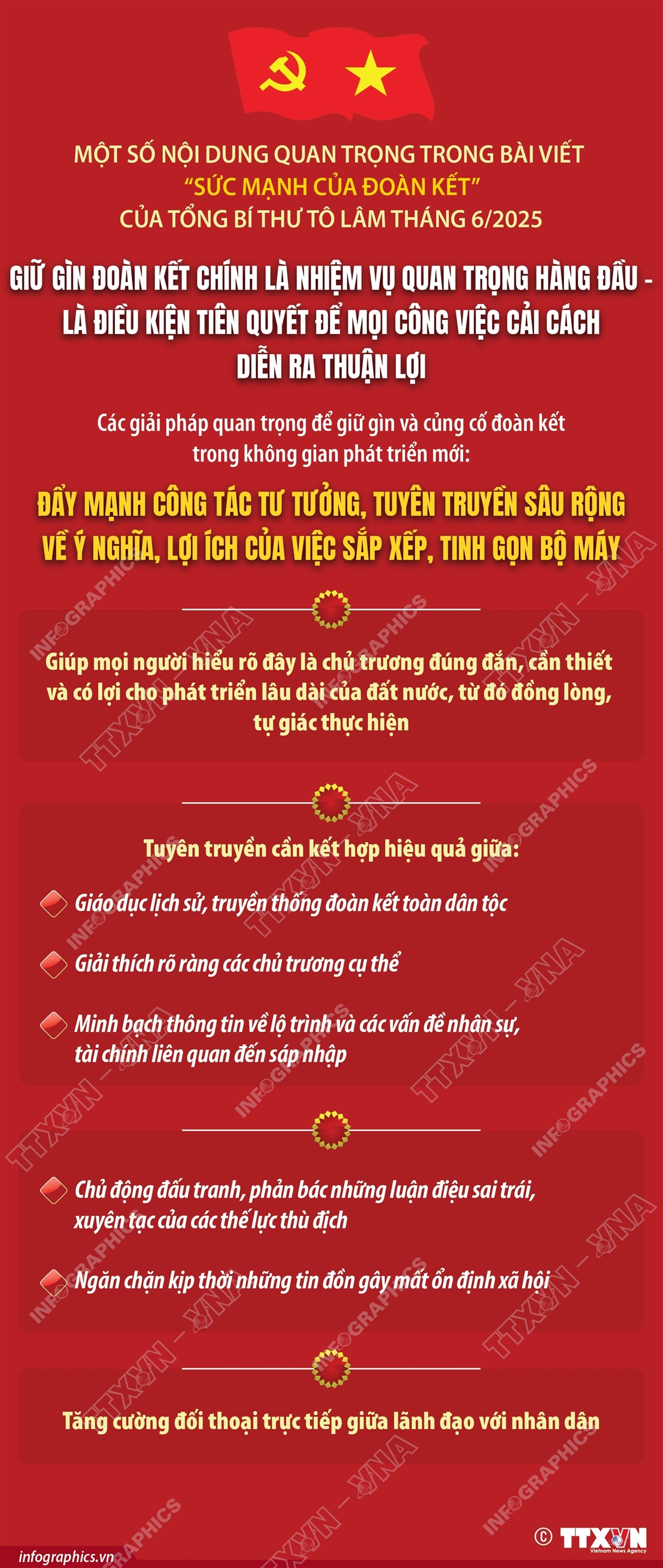 Hà Nội (TTXVN 29/6) Trong bài viết “Sức mạnh của đoàn kết” viết tháng 6/2025, Tổng Bí thư Tô Lâm nhấn mạnh, để giữ gìn và củng cố đoàn kết trong không gian phát triển mới, cần triển khai đồng bộ một số giải pháp quan trọng. Một trong những giải pháp đó là đẩy mạnh công tác tư tưởng, tuyên truyền sâu rộng trong toàn thể cán bộ, đảng viên và các tầng lớp nhân dân về ý nghĩa, lợi ích của việc sắp xếp, tinh gọn bộ máy, giúp mọi người hiểu rõ đây là chủ trương đúng đắn, cần thiết và có lợi cho phát triển lâu dài của đất nước, từ đó đồng lòng, tự giác thực hiện. Việc tuyên truyền cần kết hợp hiệu quả giữa giáo dục lịch sử, truyền thống đoàn kết toàn dân tộc với việc giải thích rõ ràng các chủ trương cụ thể, minh bạch thông tin về lộ trình và các vấn đề nhân sự, tài chính liên quan đến sáp nhập. Đồng thời, phải chủ động đấu tranh, phản bác những luận điệu sai trái, xuyên tạc của các thế lực thù địch, ngăn chặn kịp thời những tin đồn gây mất ổn định xã hội. Đặc biệt, cần tăng cường đối thoại trực tiếp giữa lãnh đạo với nhân dân, giúp giải tỏa những băn khoăn, nghi ngờ, củng cố vững chắc niềm tin và sự đoàn kết trong toàn xã hội.
