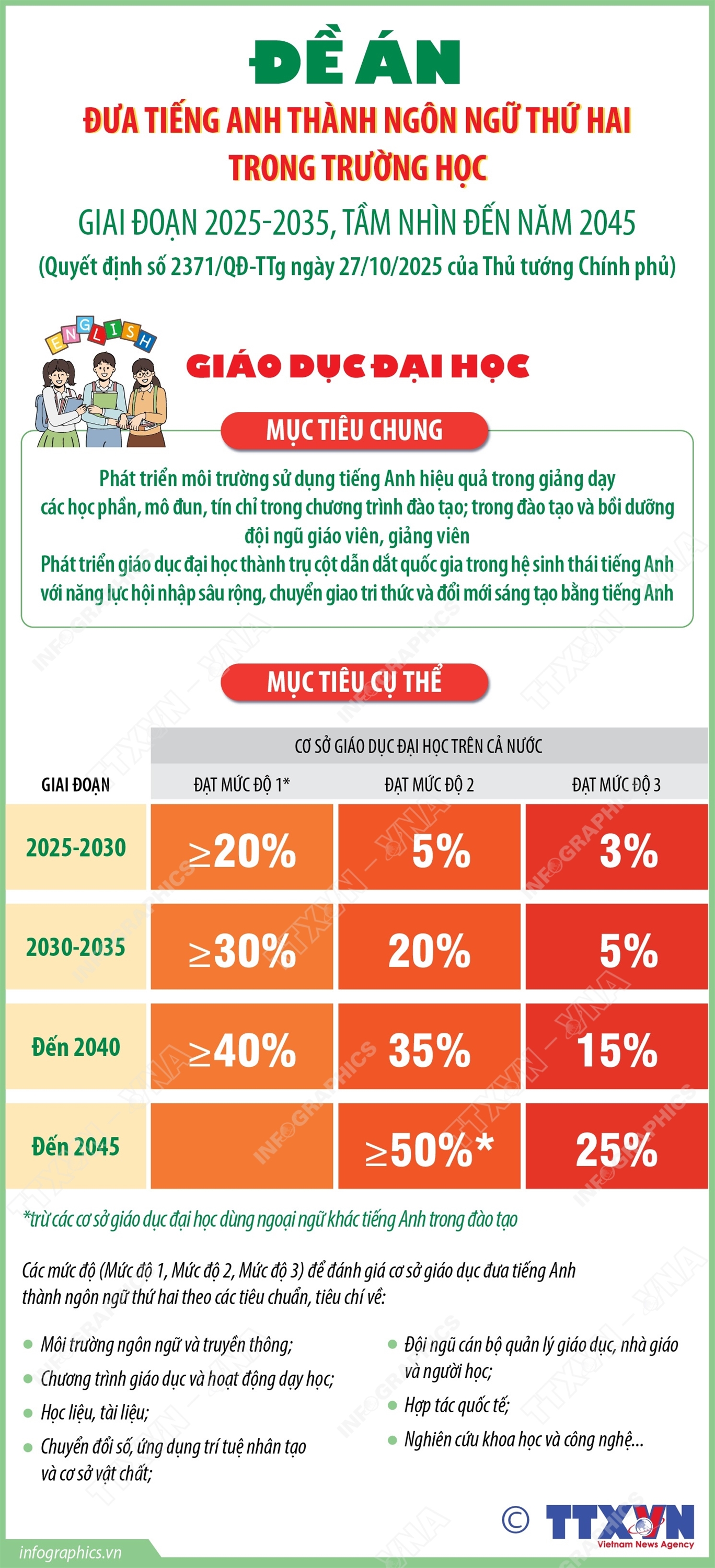 Hà Nội (TTXVN 3/11) Phó Thủ tướng Lê Thành Long ký Quyết định số 2371/QĐ-TTg phê duyệt Đề án “Đưa tiếng Anh thành ngôn ngữ thứ hai trong trường học giai đoạn 2025 - 2035, tầm nhìn đến năm 2045”. Mục tiêu của Đề án là đưa tiếng Anh thành ngôn ngữ thứ hai trong trường học ở Việt Nam; tiếng Anh được sử dụng rộng rãi, thường xuyên, hiệu quả trong dạy học, giao tiếp, quản lý và các hoạt động giáo dục của nhà trường, hình thành hệ sinh thái sử dụng tiếng Anh trong các cơ sở giáo dục từ Mức độ 1 đến Mức độ 3. Nâng cao chất lượng dạy học tiếng Anh, dạy học bằng tiếng Anh để góp phần xây dựng thế hệ công dân toàn cầu đáp ứng yêu cầu hội nhập quốc tế của Việt Nam. Mục tiêu chung của Giáo dục đại học là: Phát triển môi trường sử dụng tiếng Anh hiệu quả trong giảng dạy các học phần, mô đun, tín chỉ trong chương trình đào tạo; trong đào tạo và bồi dưỡng đội ngũ giáo viên, giảng viên. Phát triển giáo dục đại học thành trụ cột dẫn dắt quốc gia trong hệ sinh thái tiếng Anh với năng lực hội nhập sâu rộng, chuyển giao tri thức và đổi mới sáng tạo bằng tiếng Anh.