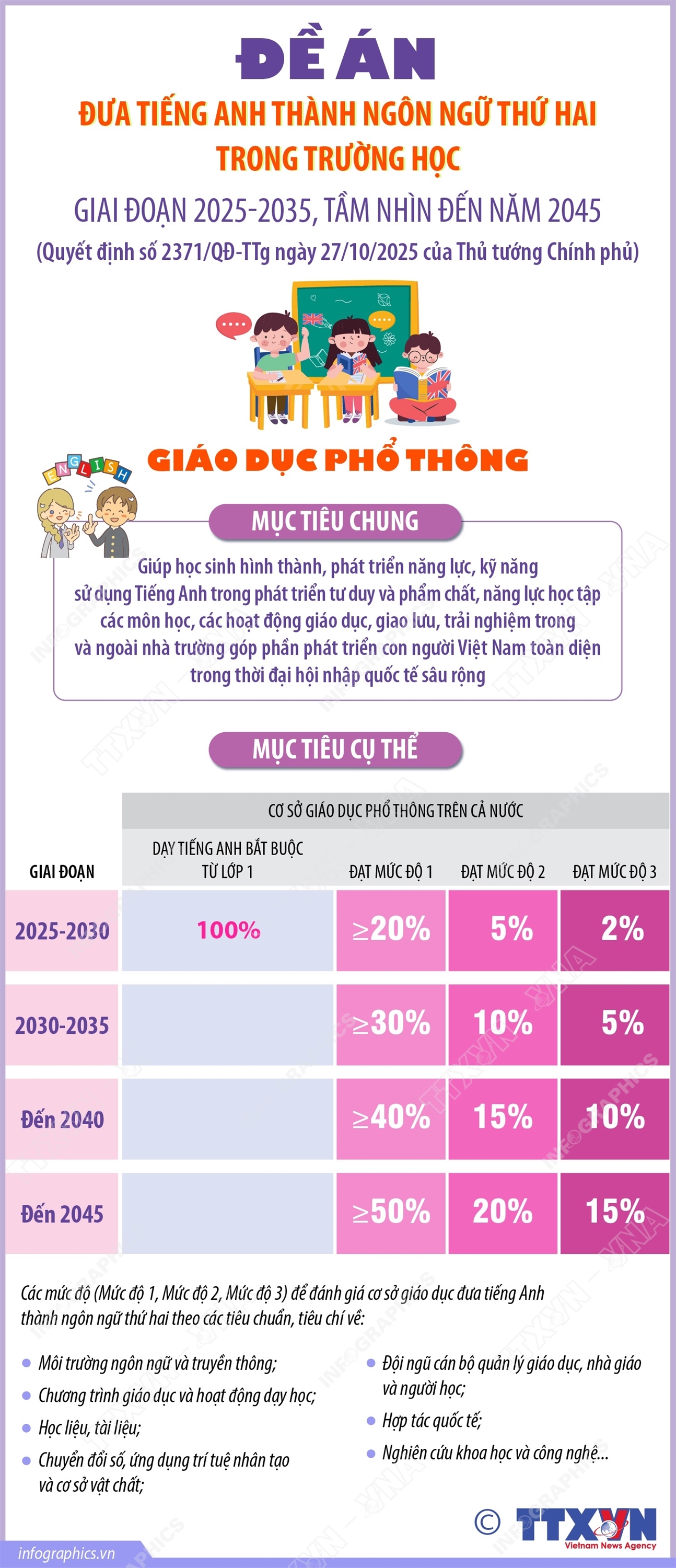 Hà Nội (TTXVN 3/11) Phó Thủ tướng Lê Thành Long ký Quyết định số 2371/QĐ-TTg phê duyệt Đề án “Đưa tiếng Anh thành ngôn ngữ thứ hai trong trường học giai đoạn 2025 - 2035, tầm nhìn đến năm 2045”. Mục tiêu của Đề án là đưa tiếng Anh thành ngôn ngữ thứ hai trong trường học ở Việt Nam; tiếng Anh được sử dụng rộng rãi, thường xuyên, hiệu quả trong dạy học, giao tiếp, quản lý và các hoạt động giáo dục của nhà trường, hình thành hệ sinh thái sử dụng tiếng Anh trong các cơ sở giáo dục từ Mức độ 1 đến Mức độ 3. Nâng cao chất lượng dạy học tiếng Anh, dạy học bằng tiếng Anh để góp phần xây dựng thế hệ công dân toàn cầu đáp ứng yêu cầu hội nhập quốc tế của Việt Nam. Mục tiêu chung của Giáo dục phổ thông là: Giúp học sinh hình thành, phát triển năng lực, kỹ năng sử dụng Tiếng Anh trong phát triển tư duy và phẩm chất, năng lực học tập các môn học, các hoạt động giáo dục, giao lưu, trải nghiệm trong và ngoài nhà trường góp phần phát triển con người Việt Nam toàn diện trong thời đại hội nhập quốc tế sâu rộng.