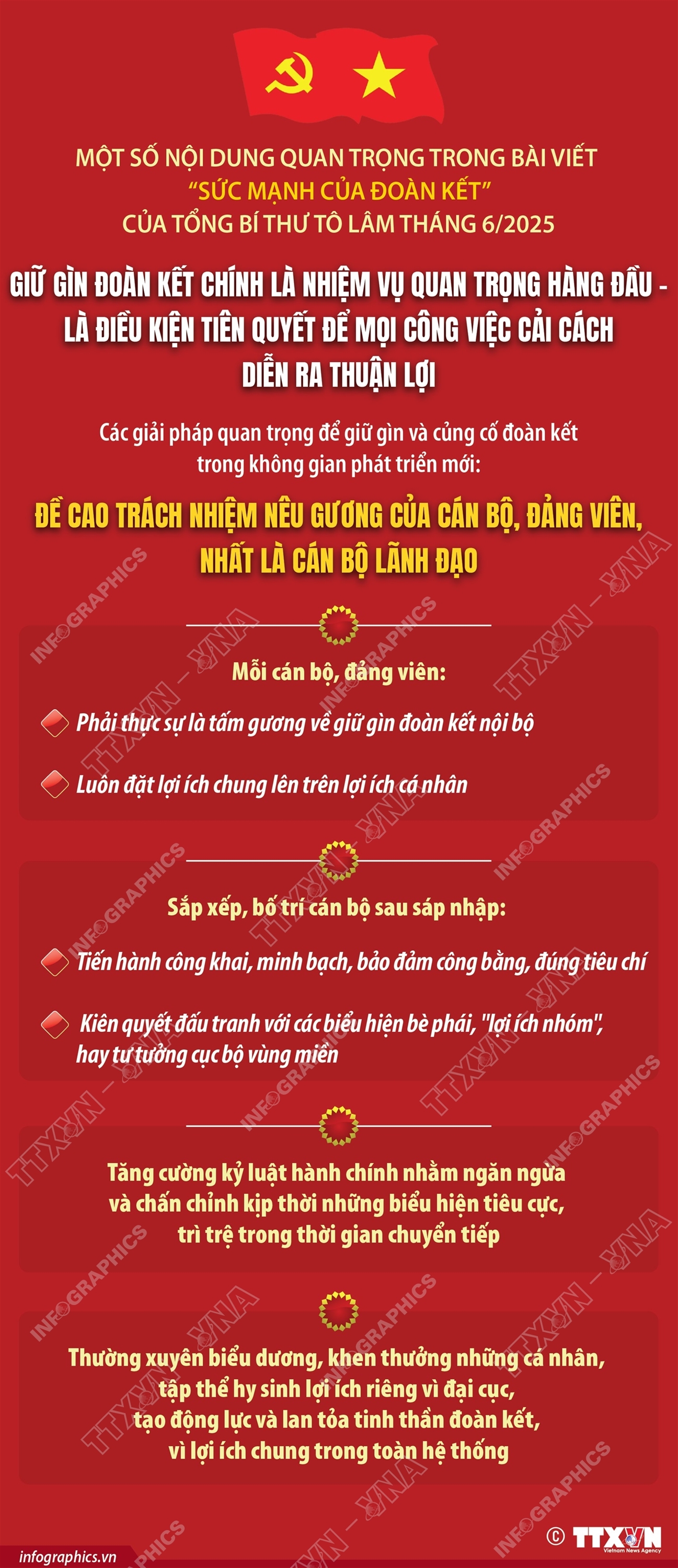 Hà Nội (TTXVN 29/6) Trong bài viết “Sức mạnh của đoàn kết” viết tháng 6/2025, Tổng Bí thư Tô Lâm nhấn mạnh, để giữ gìn và củng cố đoàn kết trong không gian phát triển mới, cần triển khai đồng bộ một số giải pháp quan trọng. Một trong những giải pháp đó là đề cao trách nhiệm nêu gương của cán bộ, đảng viên, nhất là cán bộ lãnh đạo. Mỗi cán bộ, đảng viên phải thực sự là tấm gương về giữ gìn đoàn kết nội bộ, luôn đặt lợi ích chung lên trên lợi ích cá nhân. Việc sắp xếp, bố trí cán bộ sau sáp nhập phải được tiến hành một cách công khai, minh bạch, bảo đảm công bằng, đúng tiêu chí, kiên quyết đấu tranh với các biểu hiện bè phái, "lợi ích nhóm", hay tư tưởng cục bộ vùng miền. Song song với đó, kỷ luật hành chính cần được tăng cường mạnh mẽ nhằm ngăn ngừa và chấn chỉnh kịp thời những biểu hiện tiêu cực, trì trệ trong thời gian chuyển tiếp. Đặc biệt, phải thường xuyên biểu dương, khen thưởng những cá nhân, tập thể hy sinh lợi ích riêng vì đại cục, tạo động lực và lan tỏa tinh thần đoàn kết, vì lợi ích chung trong toàn hệ thống.