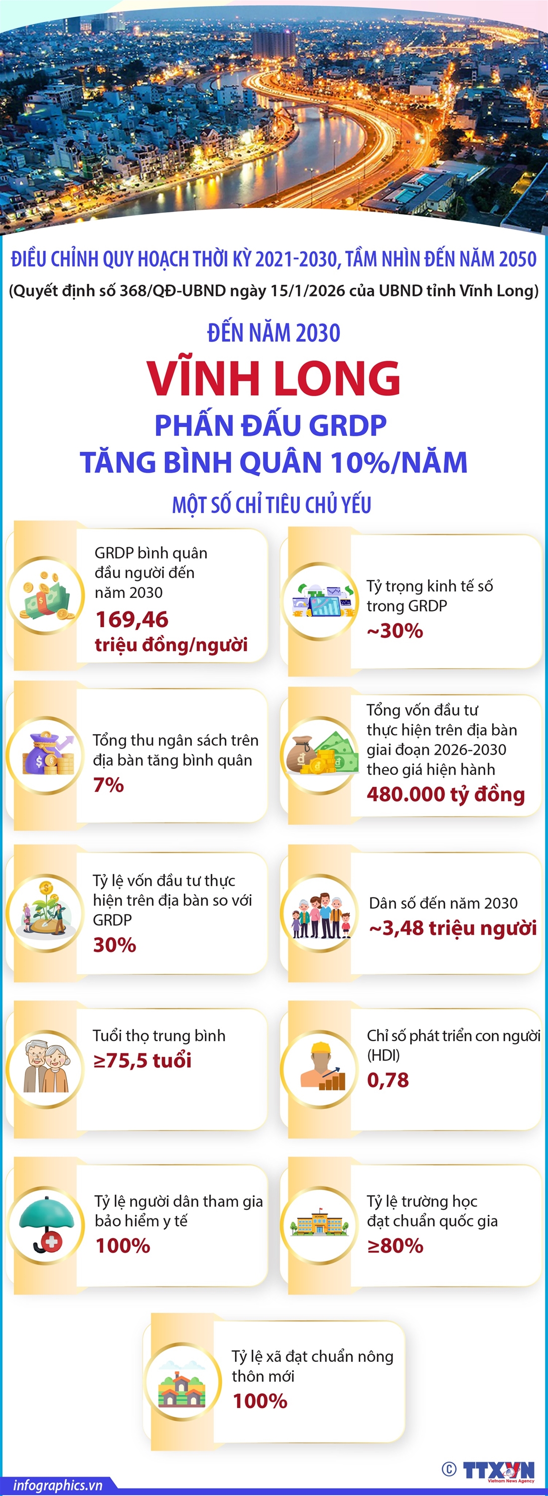 Hà Nội (TTXVN 1/4) Theo Quyết định số 368/QĐ-UBND ngày 15/1/2026 của UBND tỉnh Vĩnh Long Phê duyệt điều chỉnh Quy hoạch thời kỳ 2021-2030, tầm nhìn đến năm 2050, Mục tiêu đến năm 2030: Vĩnh Long trở thành địa phương phát triển năng động, bền vững, là trung tâm kinh tế biển và năng lượng tái tạo của vùng; hạ tầng đồng bộ, hiện đại; kinh tế tăng trưởng nhanh, gắn với đổi mới sáng tạo, chuyển đổi số và xanh; đời sống Nhân dân được nâng cao, an sinh xã hội bảo đảm, chủ động thích ứng biến đổi khí hậu.