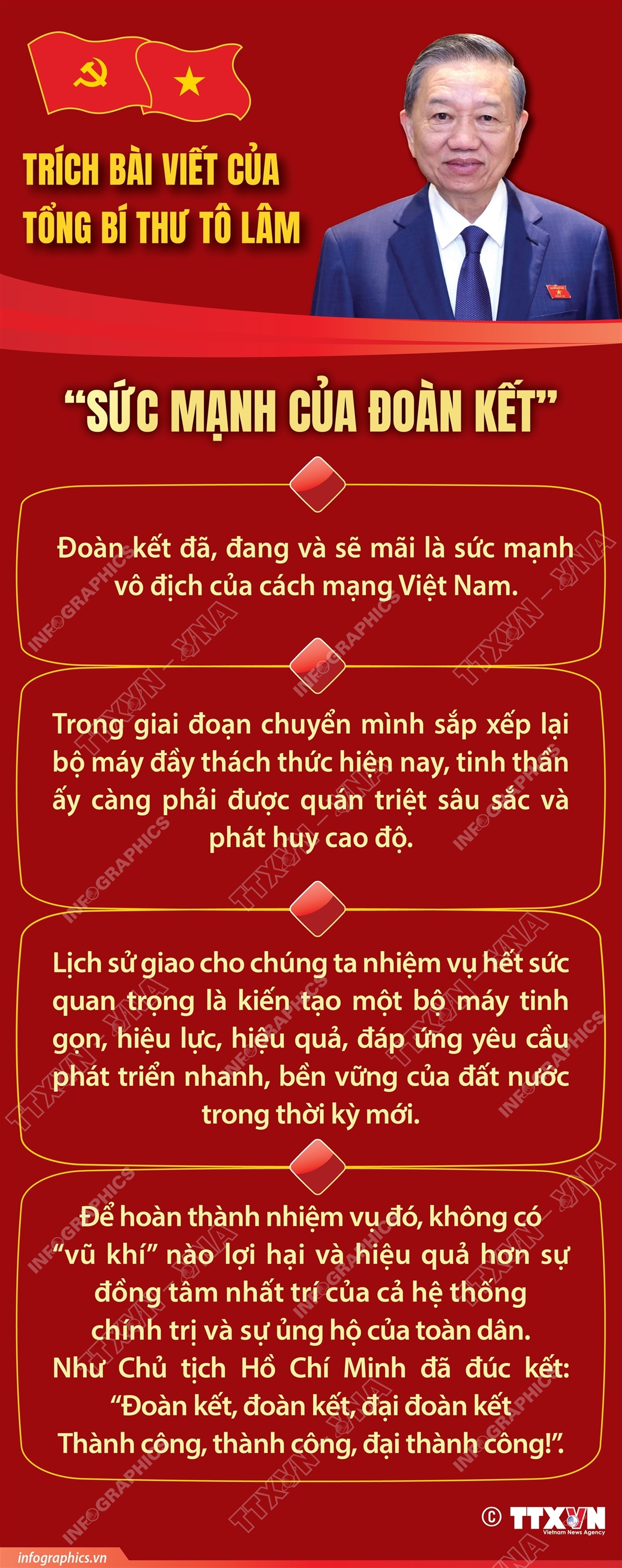 Hà Nội (TTXVN 29/6) Trong bài viết "Sức mạnh của đoàn kết" viết tháng 6/2025, Tổng Bí thư Tô Lâm khẳng định: Đoàn kết đã, đang và sẽ mãi là sức mạnh vô địch của cách mạng Việt Nam. Trong giai đoạn chuyển mình sắp xếp lại bộ máy đầy thách thức hiện nay, tinh thần ấy càng phải được quán triệt sâu sắc và phát huy cao độ. Lịch sử giao cho chúng ta nhiệm vụ hết sức quan trọng là kiến tạo một bộ máy tinh gọn, hiệu lực, hiệu quả, đáp ứng yêu cầu phát triển nhanh, bền vững của đất nước trong thời kỳ mới. Để hoàn thành nhiệm vụ đó, không có “vũ khí” nào lợi hại và hiệu quả hơn sự đồng tâm nhất trí của cả hệ thống chính trị và sự ủng hộ của toàn dân. Như Chủ tịch Hồ Chí Minh đã đúc kết: “Đoàn kết, đoàn kết, đại đoàn kết - Thành công, thành công, đại thành công!”.