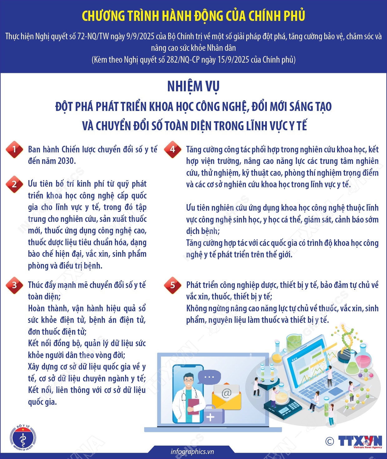Hà Nội (TTXVN 30/10) Tại Chương trình hành động thực hiện Nghị quyết số 72-NQ/TW ngày 9/9/2025 của Bộ Chính trị, Chính phủ xác định 5 nhiệm vụ cụ thể để các bộ, ngành, địa phương xây dựng kế hoạch hành động, tổ chức triển khai, kiểm tra, giám sát, đánh giá việc thực hiện Nghị quyết số 72-NQ/TW để đạt mục tiêu xây dựng một nước Việt Nam khỏe mạnh, mọi người dân đều được chăm sóc sức khỏe, sống lâu, sống khỏe, sống lành mạnh, nâng cao thể chất, ý thức bảo vệ sức khỏe và chủ động phòng ngừa bệnh tật trong toàn xã hội, góp phần quan trọng thúc đẩy phát triển đất nước giàu mạnh, văn minh, thịnh vượng trong kỷ nguyên mới. Đó là các nhiệm vụ: Đổi mới mạnh mẽ tư duy và hành động trong lãnh đạo, chỉ đạo và tổ chức thực hiện công tác chăm sóc sức khỏe Nhân dân; Hoàn thiện thể chế, tập trung nâng cao năng lực hệ thống y tế, nhất là y tế dự phòng, y tế cơ sở, phát huy thế mạnh của y học cổ truyền; Nâng cao y đức, phát triển nhân lực y tế chất lượng, đồng bộ, đáp ứng sự hài lòng của người bệnh và hội nhập quốc tế; Đẩy mạnh cải cách tài chính y tế và phát triển hiệu quả, bền vững chính sách BHYT; Đột phá phát triển khoa học công nghệ, đổi mới sáng tạo và chuyển đổi số toàn diện trong lĩnh vực y tế; Đẩy mạnh phát triển y tế tư nhân, huy động và sử dụng hiệu quả mọi nguồn lực cho phát triển y tế.