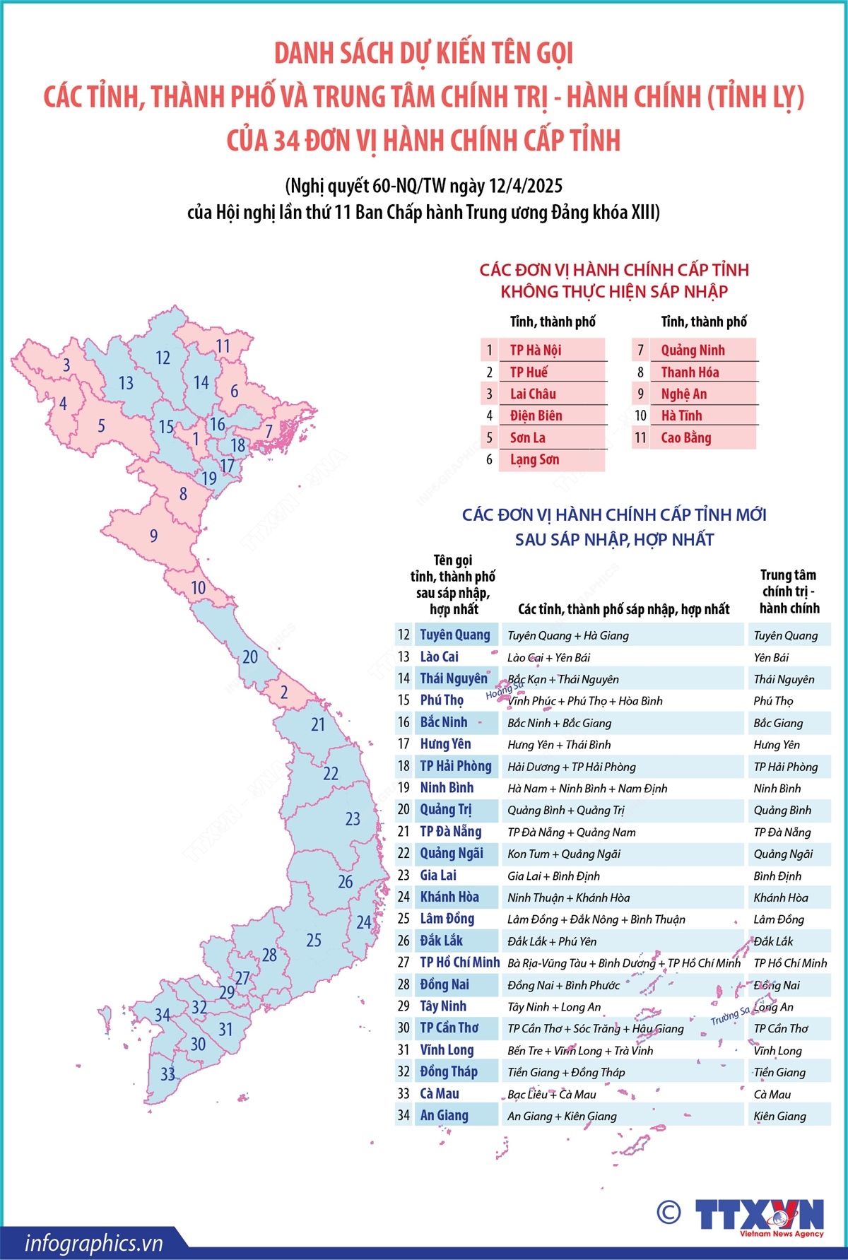 Dự kiến tên gọi của 34 đơn vị hành chính cấp tỉnh sau sáp nhập, hợp nhất