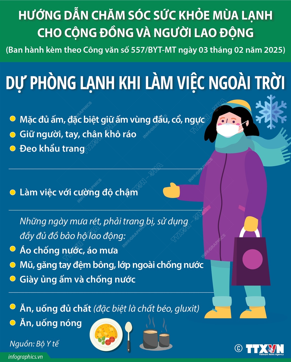 Nếu phải làm việc ngoài trời cần giữ ấm cơ thể và làm việc với cường độ chậm. Cần phải giữ người, tay chân khô ráo, tránh ẩm ướt đặc biệt là công nhân làm việc ngoài trời, trong hầm lò… Đeo khẩu trang trong khi làm việc để bảo vệ đường hô hấp… là những biện pháp dự phòng bảo vệ sức khoẻ mùa lạnh đối với những người phải làm việc trong thời tiết lạnh giá.