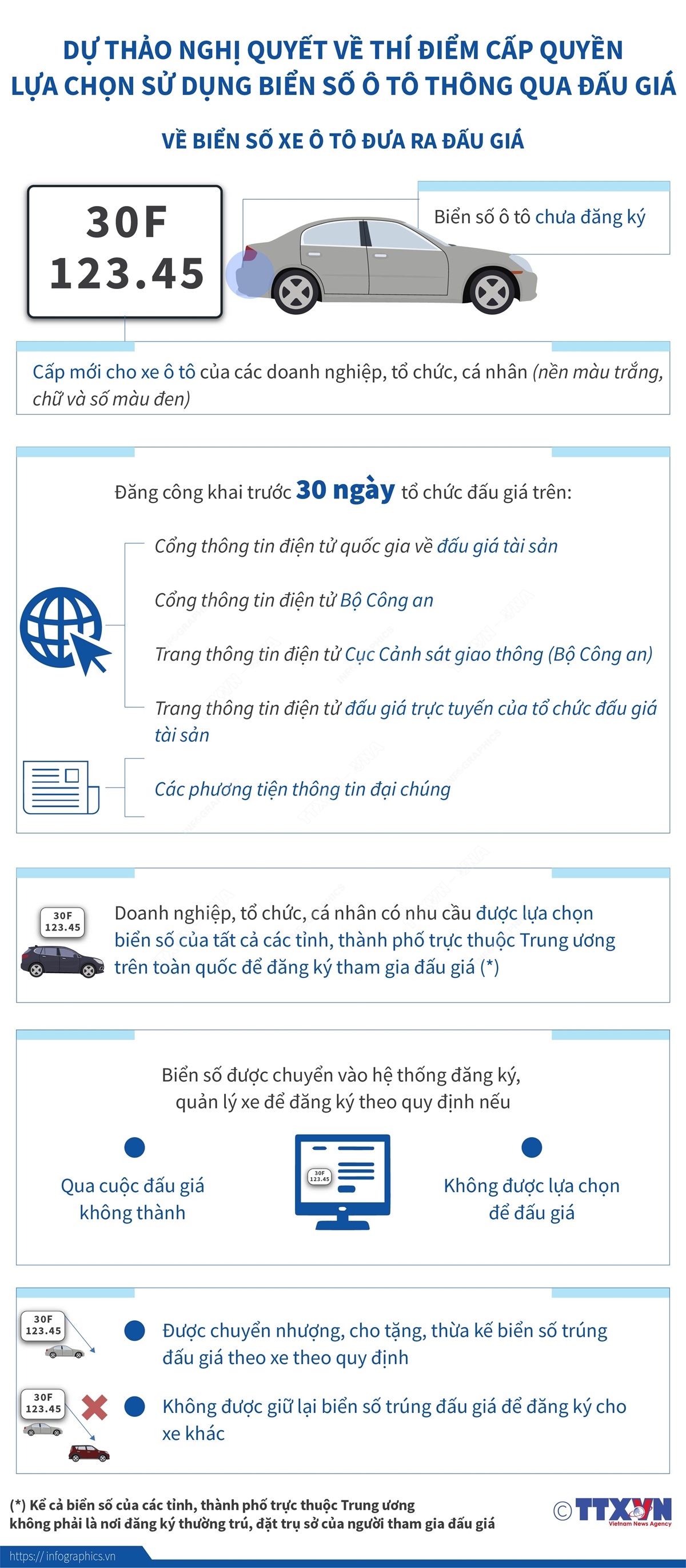 Theo Dự thảo Nghị quyết về thí điểm cấp quyền lựa chọn sử dụng biển số ô tô thông qua đấu giá, biển số đưa ra đấu giá là biển số ô tô chưa đăng ký. Bộ Công an dự kiến cấp mới cho xe ô tô của các doanh nghiệp, tổ chức, cá nhân (nền màu trắng, chữ và số màu đen), được đăng công khai trên Cổng thông tin điện tử quốc gia về đấu giá tài sản, Cổng thông tin điện tử Bộ Công an, Trang thông tin điện tử Cục Cảnh sát giao thông (Bộ Công an), trang thông tin điện tử đấu giá trực tuyến của tổ chức đấu giá tài sản và trên các phương tiện thông tin đại chúng trước 30 ngày tổ chức đấu giá.
