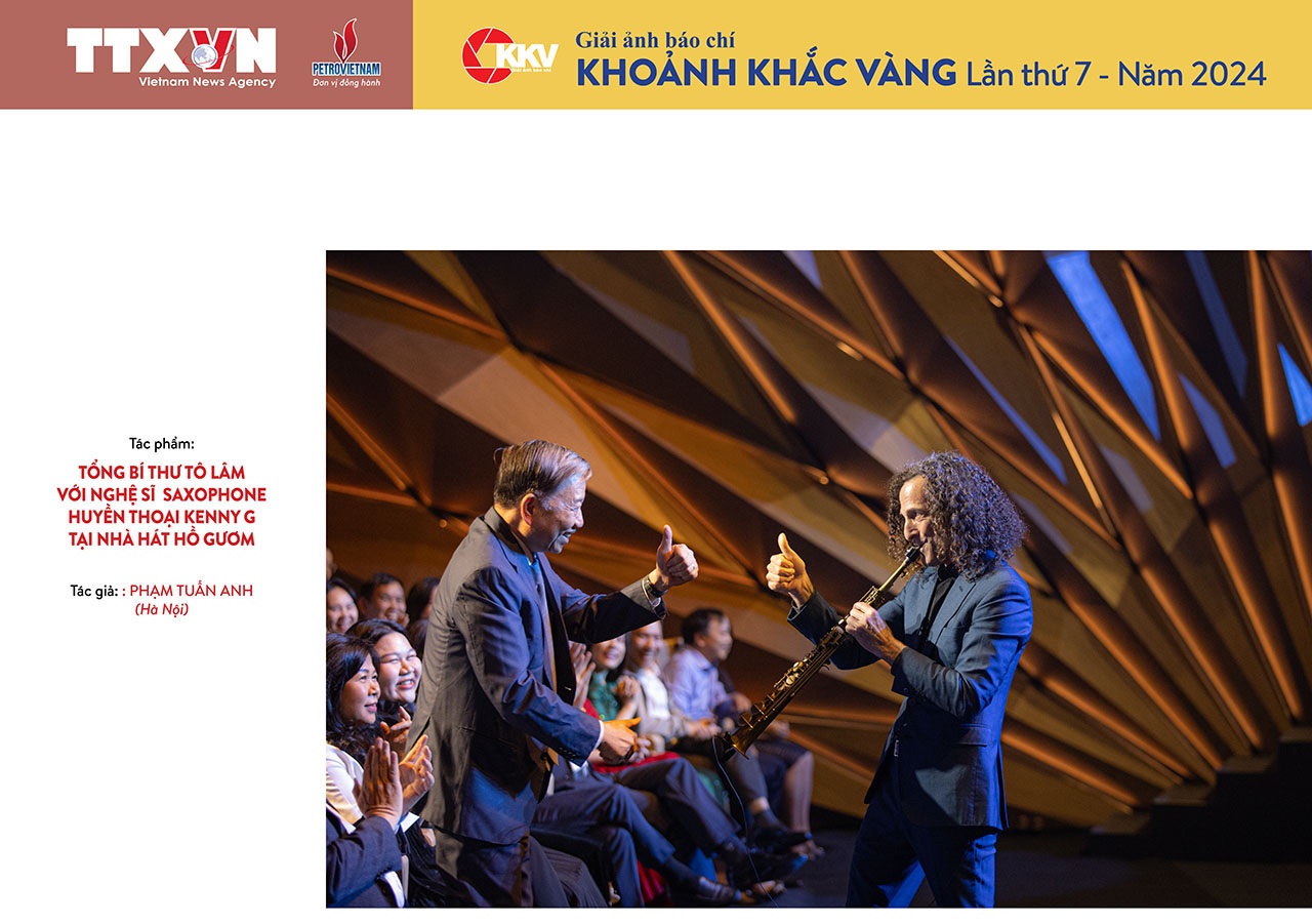 Bức ảnh đồng chí Tô Lâm với nghệ sĩ saxophone huyền thoại KennyG được tôi chụp đúng khoảnh khắc ông trong vai trò khán giả, tươi cười đứng lên bày tỏ sự hưởng ứng và cảm xúc với nghệ sĩ Kenny G. Lúc này, nghệ sĩ cũng đang đứng rất gần với hàng ghế đầu tiên của khán phòng và vẫn tiếp tục thổi kèn. Điểm đặc biệt là cả hai người đều giơ ngón tay cái thể hiện biểu cảm trong một khuôn hình cân đối như một sự đồng điệu hiếm có. Ngay lúc đó, tôi đã nhận ra, đây là “thời điểm vàng” đối với một phóng viên ảnh. Tôi đã bấm máy liên tục và bức ảnh đã ra đời.