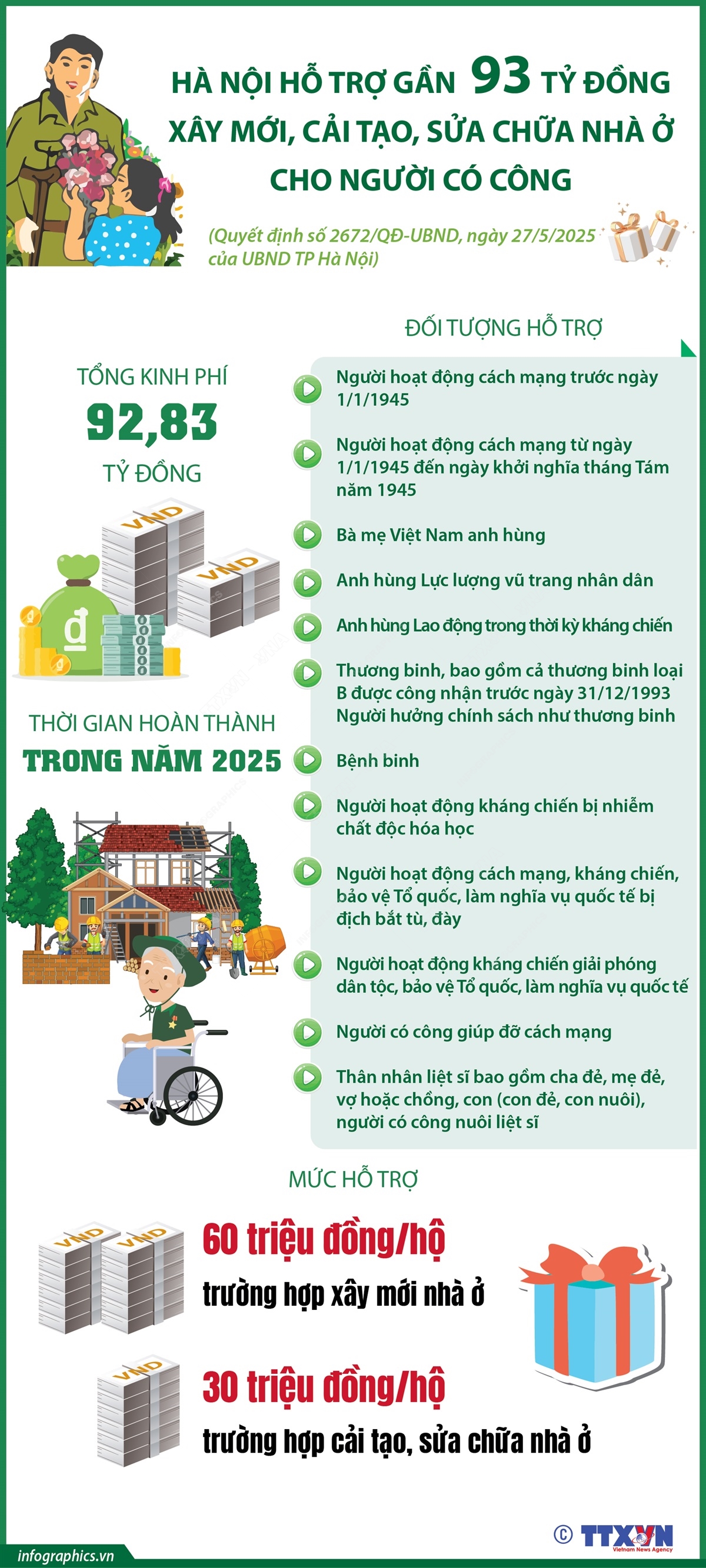 Hà Nội (TTXVN 6/6) Ủy ban nhân dân thành phố Hà Nội vừa ban hành Quyết định số 2672/QĐ-UBND ngày 27/5/2025 về việc phê duyệt Đề án hỗ trợ xây dựng mới hoặc cải tạo, sửa chữa nhà ở đối với người có công với cách mạng, thân nhân liệt sĩ trên địa bàn thành phố Hà Nội, theo quy định tại Điều 102 Nghị định số 131/2021/NĐ-CP ngày 30/12/2021 của Chính phủ và Quyết định số 21/2024/QĐ-TTg ngày 22/11/2024 của Thủ tướng Chính phủ. Theo đó, mức hỗ trợ để xây dựng mới hoặc cải tạo, sửa chữa nhà ở khoảng 60 triệu đồng/hộ đối với trường hợp xây mới nhà ở và 30 triệu đồng/hộ đối với trường hợp cải tạo, sửa chữa nhà ở. Tổng kinh phí dự kiến 92,83 tỷ đồng, hoàn thành trong năm 2025.