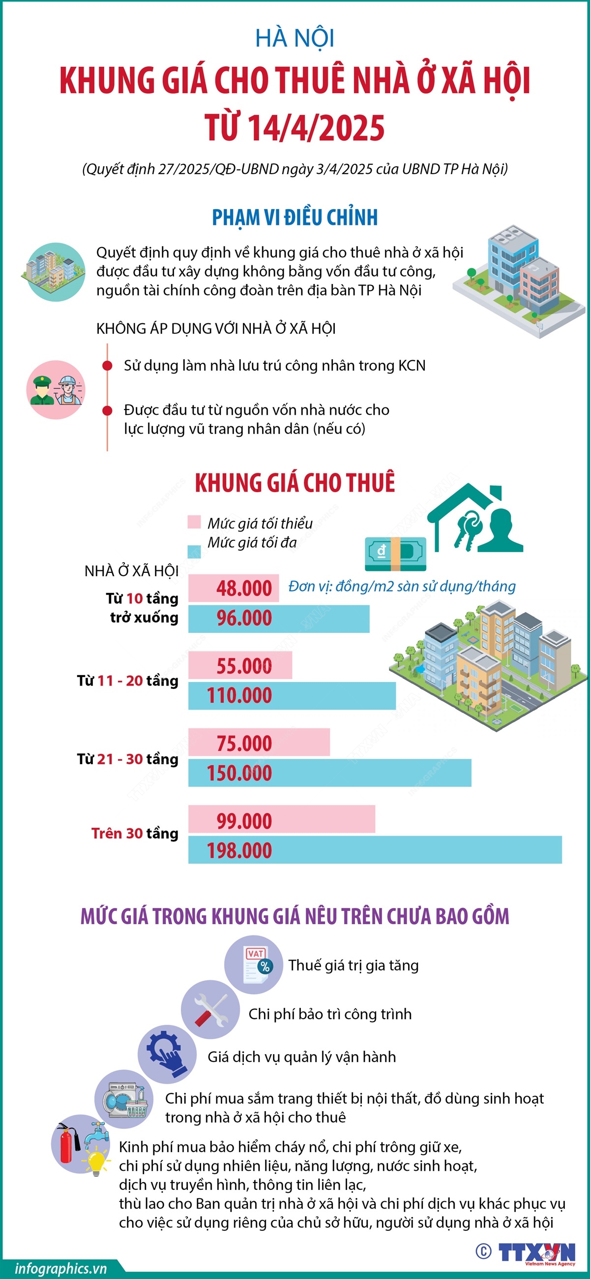 Hà Nội (TTXVN 14/4) Theo Quyết định số 27/2025/QĐ-UBND của UBND TP Hà Nội, từ 14/4/2025, mức giá cho thuê nhà ở xã hội (được đầu tư xây dựng không bằng vốn đầu tư công, nguồn tài chính công đoàn) trên địa bàn thành phố thấp nhất là 48.000 đồng/m2 sàn sử dụng/tháng, cao nhất lên tới 198.000 đồng/m2 sàn sử dụng/tháng.