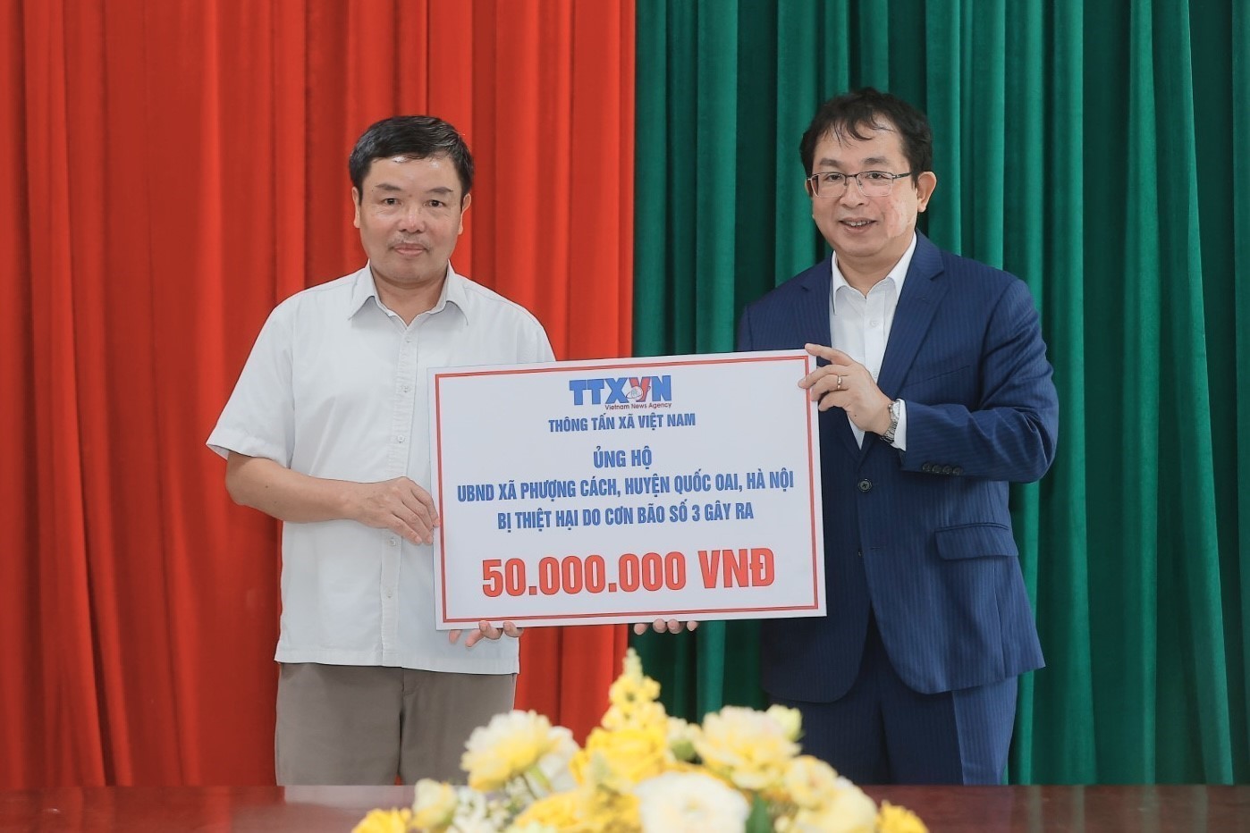 | Phó tổng giám đốc TTXVN Nguyễn Tuấn Hùng (bên phải) trao 50 triệu đồng hỗ trợ xã Phượng Cách, huyện Quốc Oai, Hà Nội khắc phục hậu quả bão số 3, ngày 17/10 |
