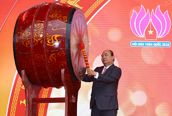 | Thủ tướng Chính phủ Nguyễn Xuân Phúc đánh trống khai mạc Hội báo toàn quốc 2019. Ảnh: Thống Nhất |