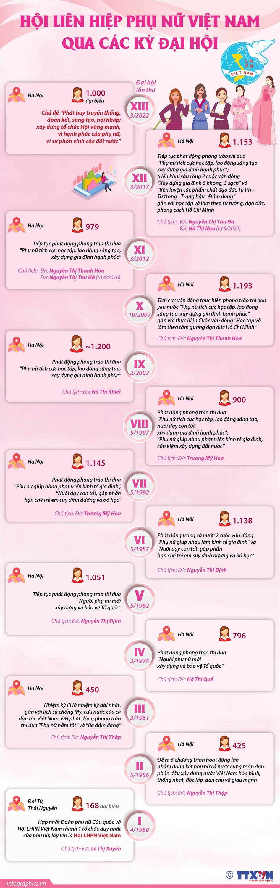 Trải qua 92 năm trưởng thành và phát triển, Hội Liên hiệp Phụ nữ (LHPN) Việt Nam đã tổ chức 12 kỳ Ðại hội (ĐH) đại biểu Phụ nữ toàn quốc. Mỗi kỳ Ðại hội là một mốc son lịch sử, đánh dấu sự phát triển không ngừng của phong trào phụ nữ Việt Nam.