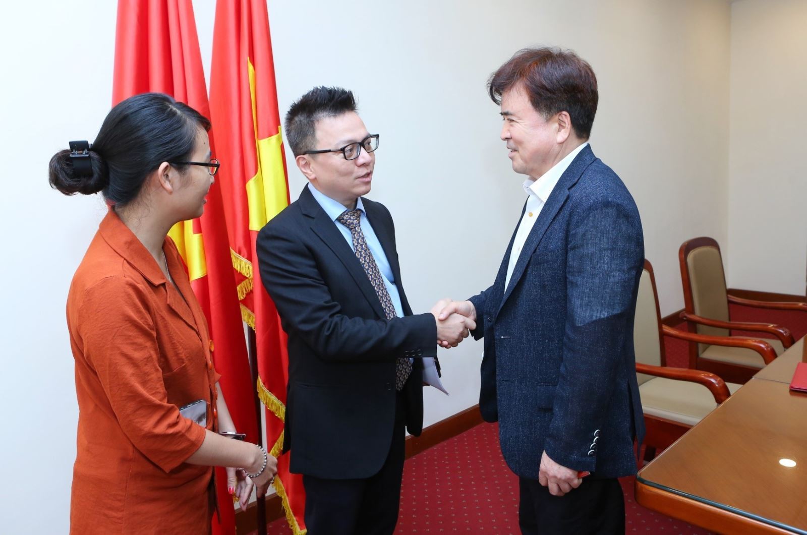 | Phó tổng giám đốc Lê Quốc Minh và Chủ tịch Thời báo Kinh tế Aju |
